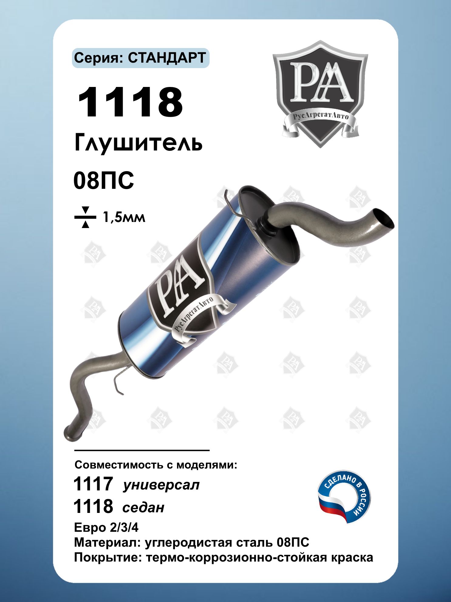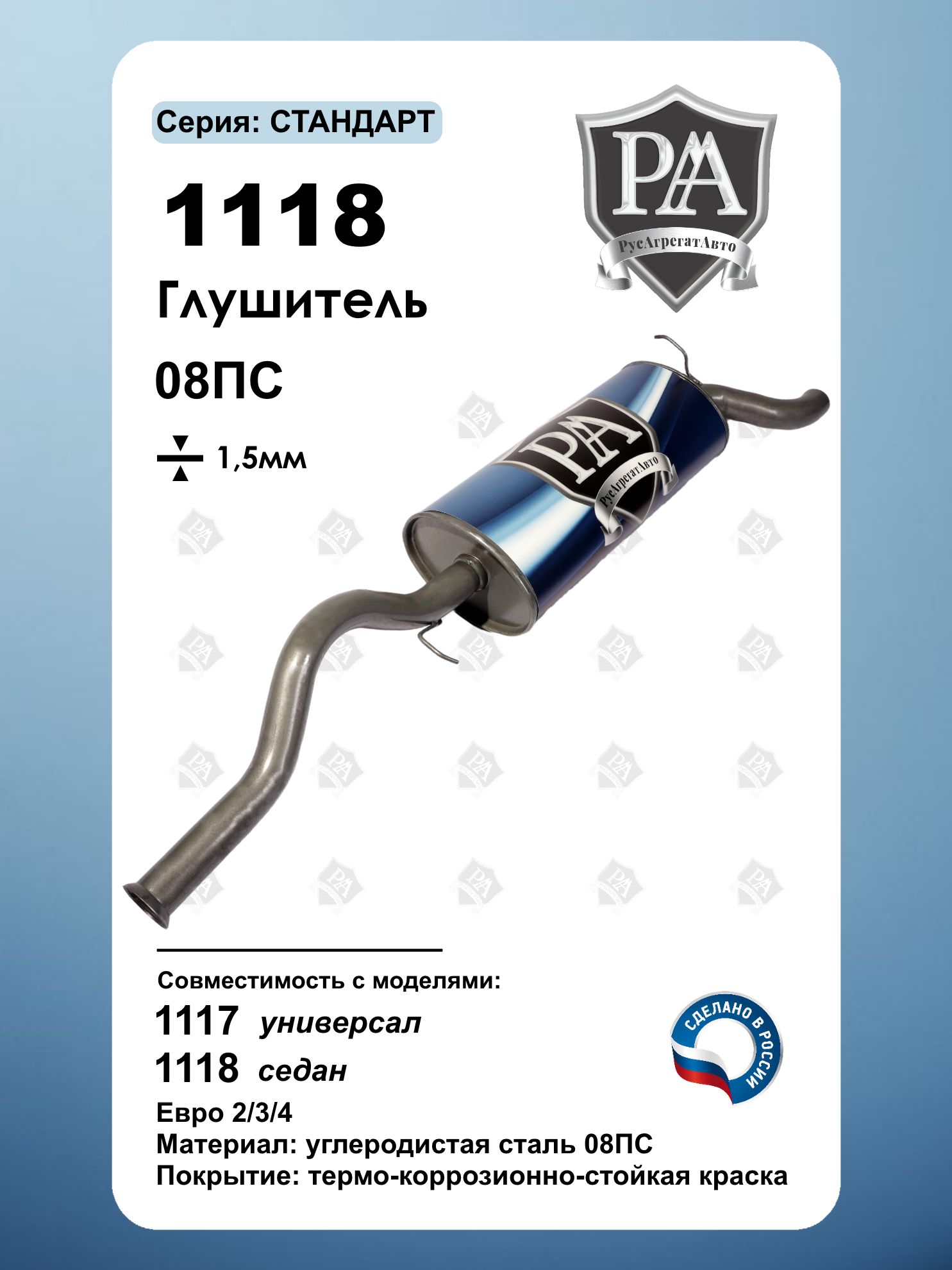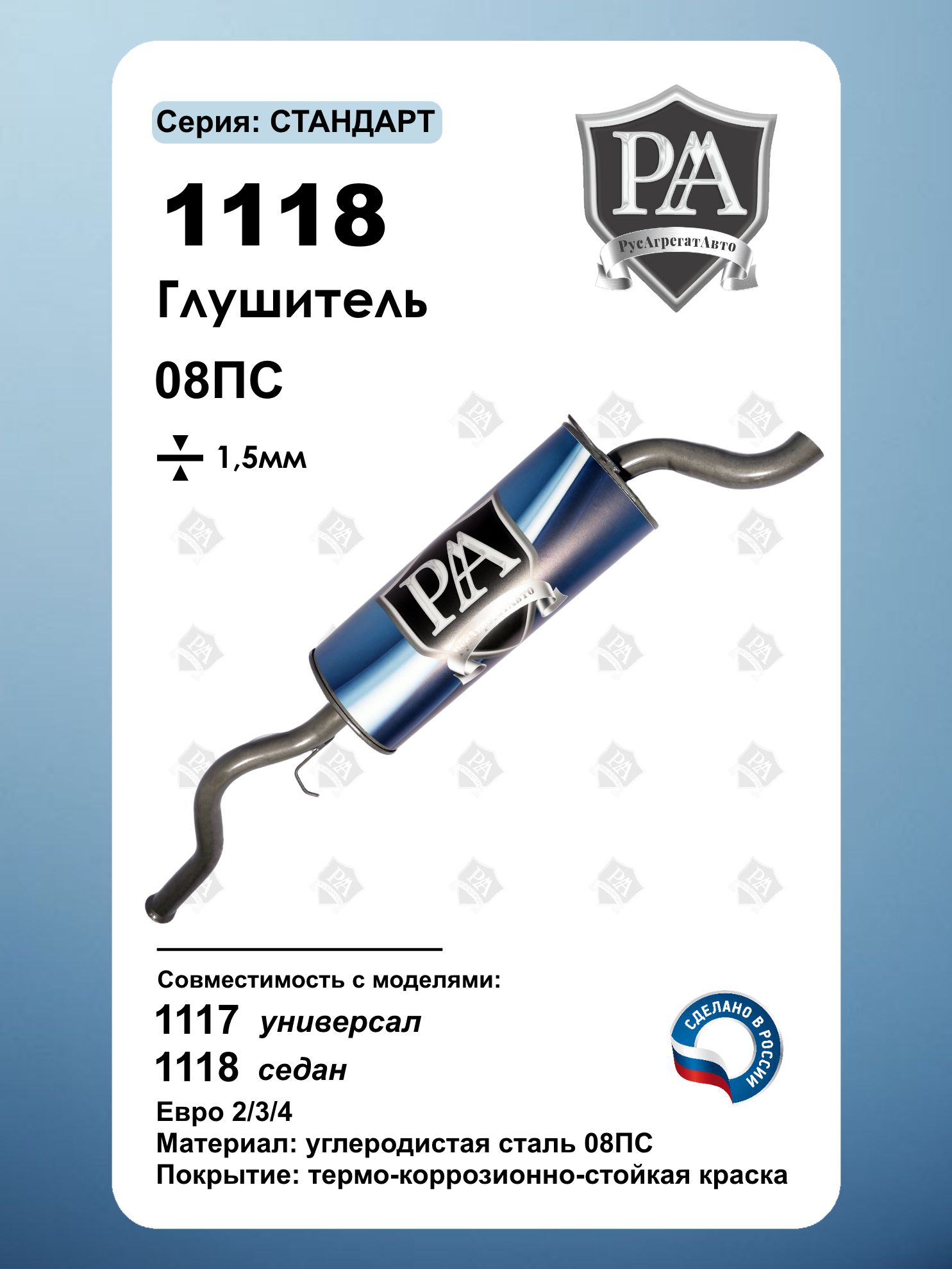 Глушитель РусАгрегатАвто серии СТАНДАРТ для 1118, 1117 (седан/универсал) – компактный и надежный! Идеальная посадка – устанавливается в штатное место без доработок, полностью соответствует заводской геометрии. Прочная конструкция – изготовлен из углеродистой стали 08ПС (1,5 мм), российское производство. Антикоррозийная защита – покрыт серебристой краской для увеличения срока службы. Соответствие стандарту ЕВРО-3 – экологичность и надежность. Быстрая установка, сниженный уровень шума и долгий срок службы – выберите качество для своей Калины! Тихая езда без вибраций – наслаждайтесь комфортом! Сделано в России Совместим с Lada Калина (Kalina)