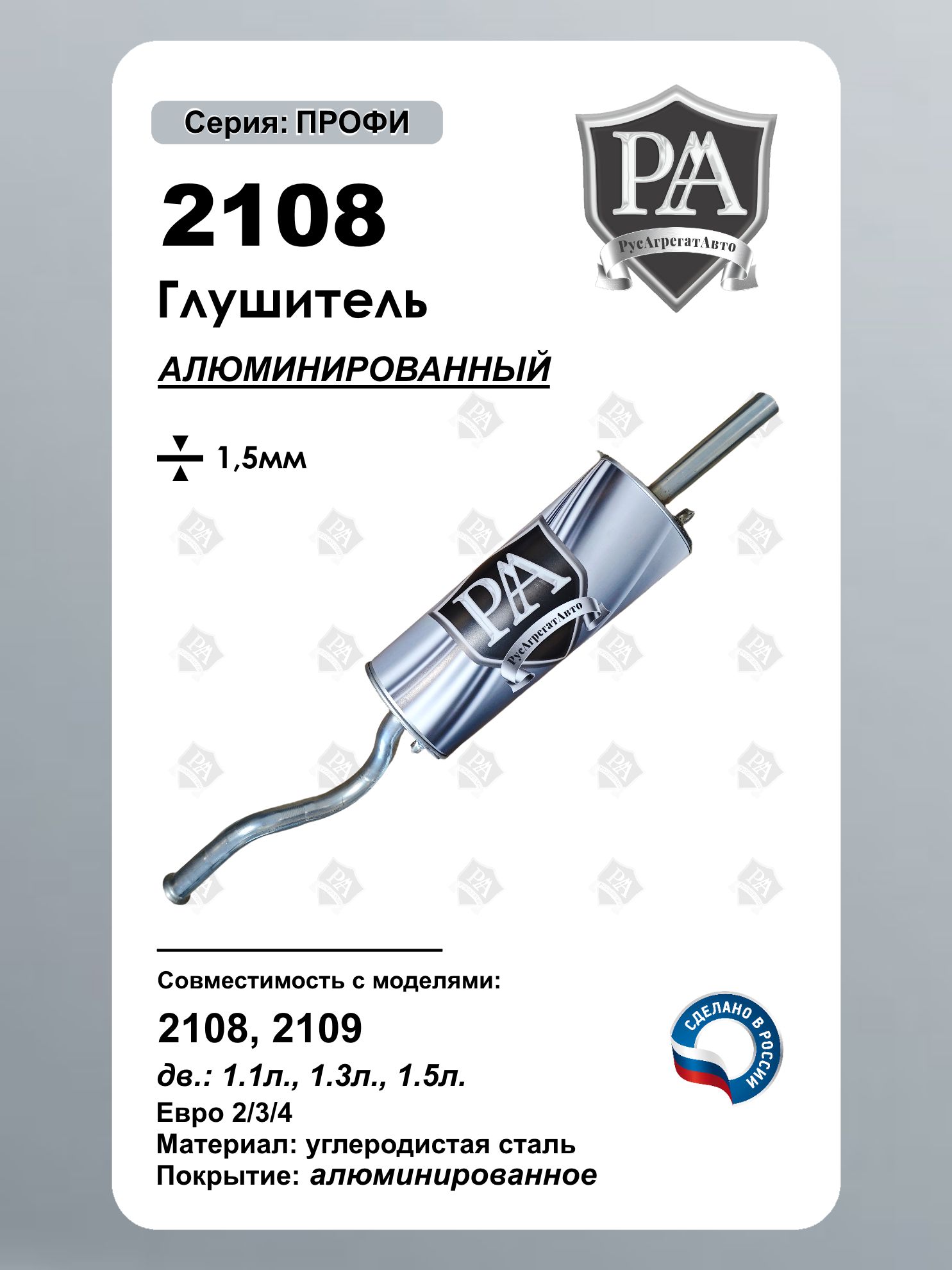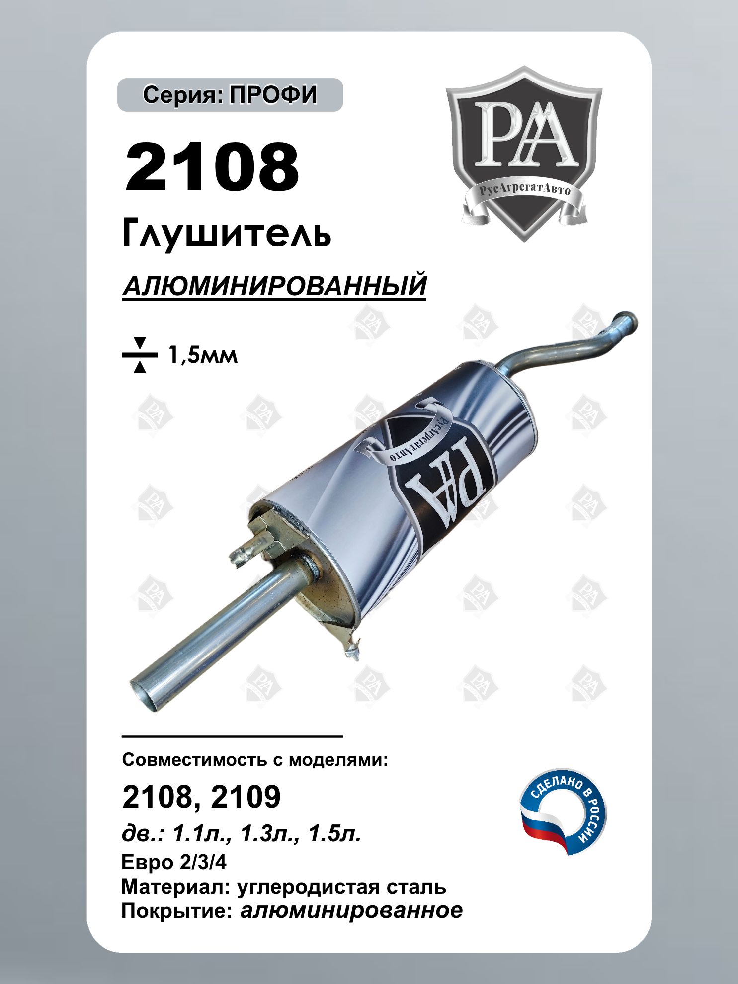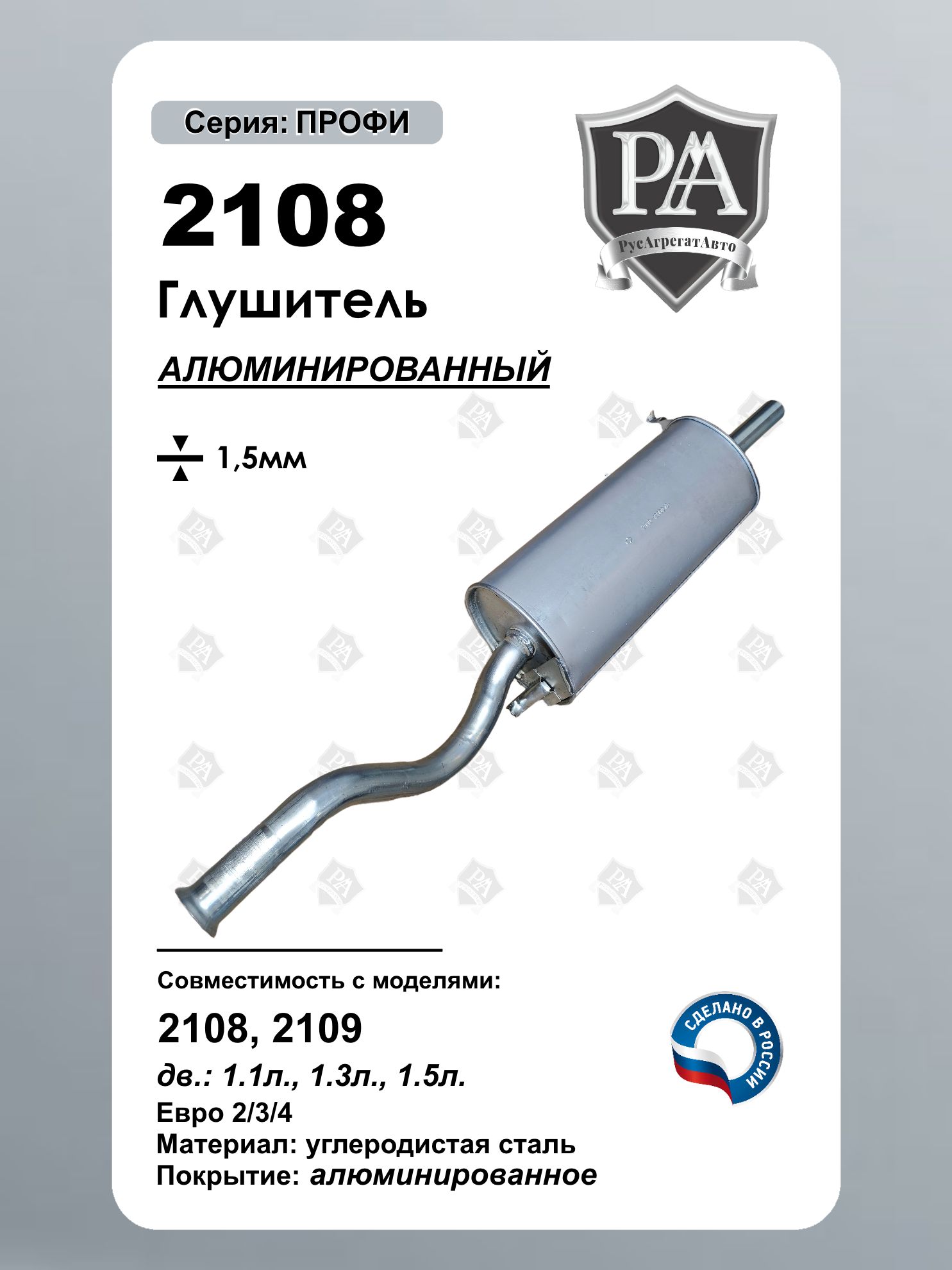 Глушитель РусАгрегатАвто из алюминированной (алюминизированной) стали серия ПРОФИ для автомобилей 2108 и 2109 (Самара) – это надежное решение для эффективной работы выхлопной системы. Изготовленный из высококачественной алюминированной (алюминизированной) стали толщиной 1,5 мм, он обеспечивает долговечность и устойчивость к коррозии. Преимущества: Совместим с ВАЗ 2108, ВАЗ 2109 Прочность и надежность – алюминированная стал гарантирует длительный срок службы даже в жестких условиях эксплуатации Идеальная геометрия – точная посадка без дополнительных доработок (полная совместимость с а/м 2108, 2109) Оптимальная шумоизоляция – снижение уровня шума для комфортной езды Сделано в России