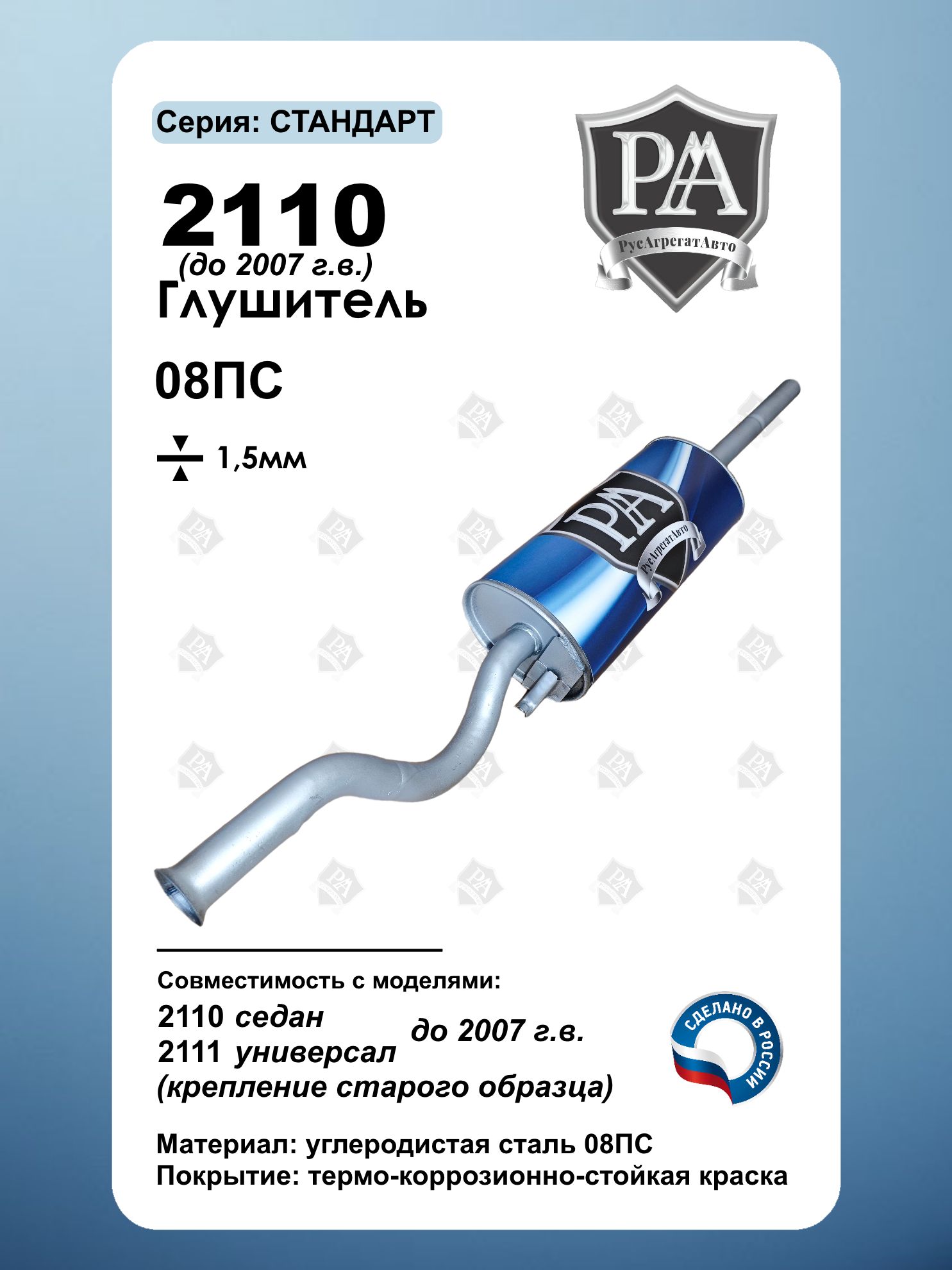 3-камерный Глушитель основной РусАгрегатАвто серии СТАНДАРТ для автомобилей 2110, 2111 (выпуска до 2008 года) с крючковым креплением старого образца Конструкция разработана на основе заводского кондуктора, что гарантирует 100% соответствие оригиналу. Ключевые преимущества: Точная оригинальная геометрия - идеальная посадка без доработок Крючковое крепление - для автомобилей выпуска до 2008 года 3-камерная запатентованная система - эффективное шумопоглощение Усиленная конструкция – сталь 1.5 мм Изготовлен из углеродистой стали 08ПС Точная заводская геометрия – установка без доработок Технические характеристики: -Совместим с ВАЗ 2110, ВАЗ 2111 (до 2008 г.в.) - Тип крепления: крючковое (старый образец) - Материал: сталь 1,5 мм - Бесшумная работа - комфорт при движении - Надежное крепление - специально для ранних моделей Сделано в России