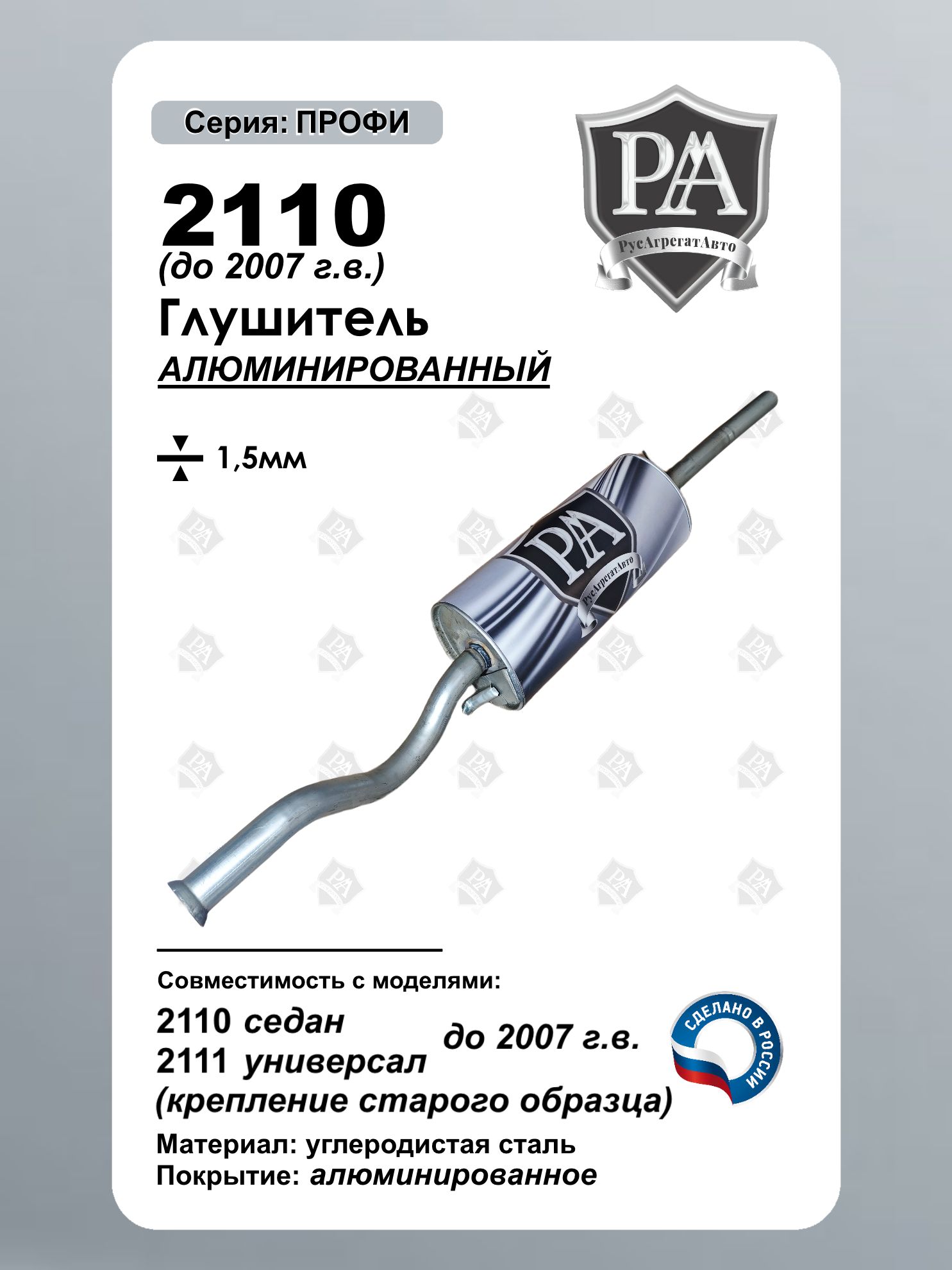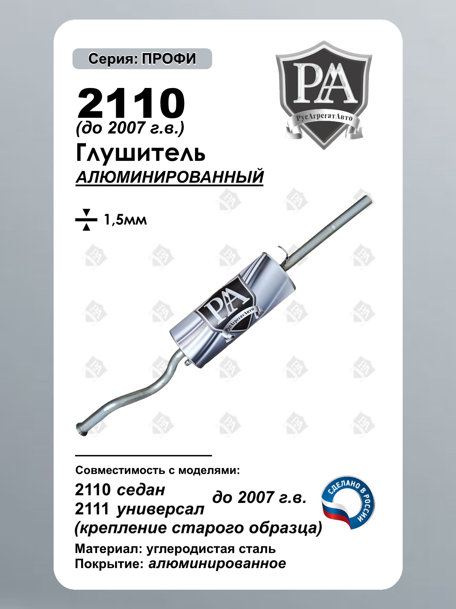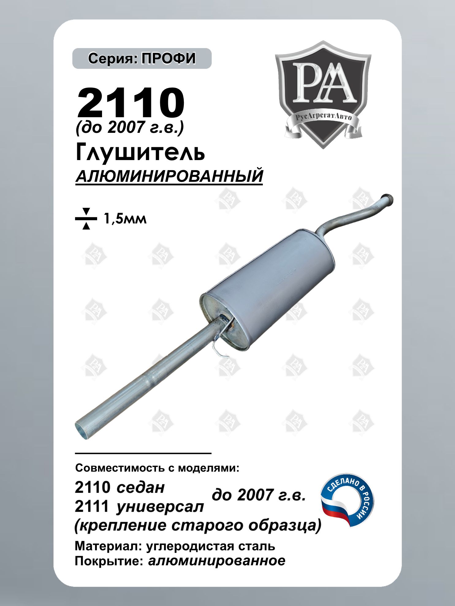 3-камерный Глушитель РусАгрегатАвто из алюминированной (алюминизированной) стали серия ПРОФИ для автомобилей 2110, 2111 (выпуска до 2008 года) с крючковым креплением старого образца Конструкция разработана на основе заводского кондуктора, что гарантирует 100% соответствие оригиналу. Ключевые преимущества: Точная оригинальная геометрия - идеальная посадка без доработок Крючковое крепление - для автомобилей выпуска до 2008 года 3-камерная запатентованная система - эффективное шумопоглощение Материал: Алюминированная сталь толщиной 1,5 мм\nТочная заводская геометрия – установка без доработок Технические характеристики: -Совместим с ВАЗ 2110, ВАЗ 2111 (до 2008 г.в.) - Тип крепления: крючковое (старый образец) - Материал: Алюминированная сталь толщиной 1,5 мм - Бесшумная работа - комфорт при движении - Надежное крепление - специально для ранних моделей Сделано в России