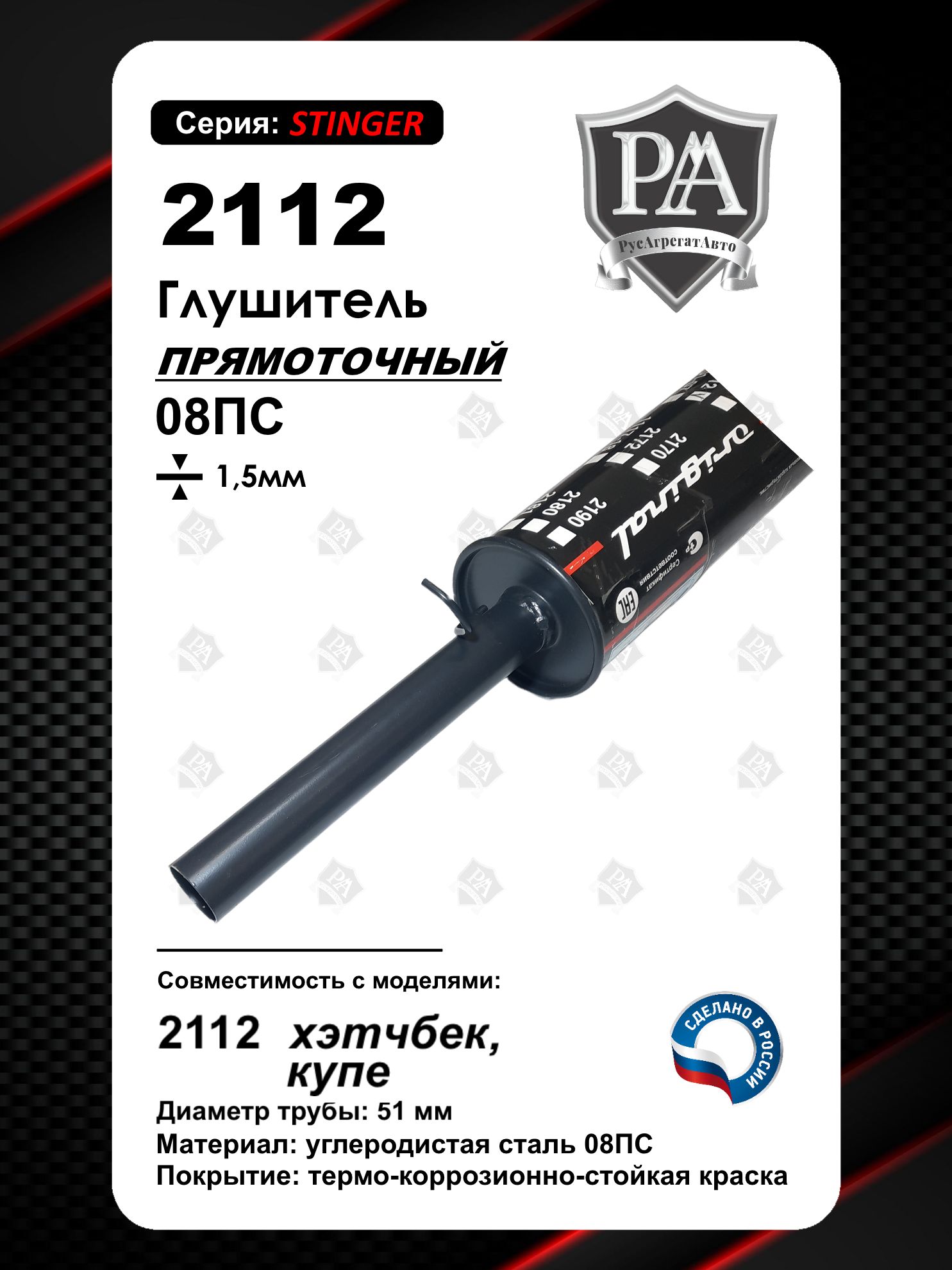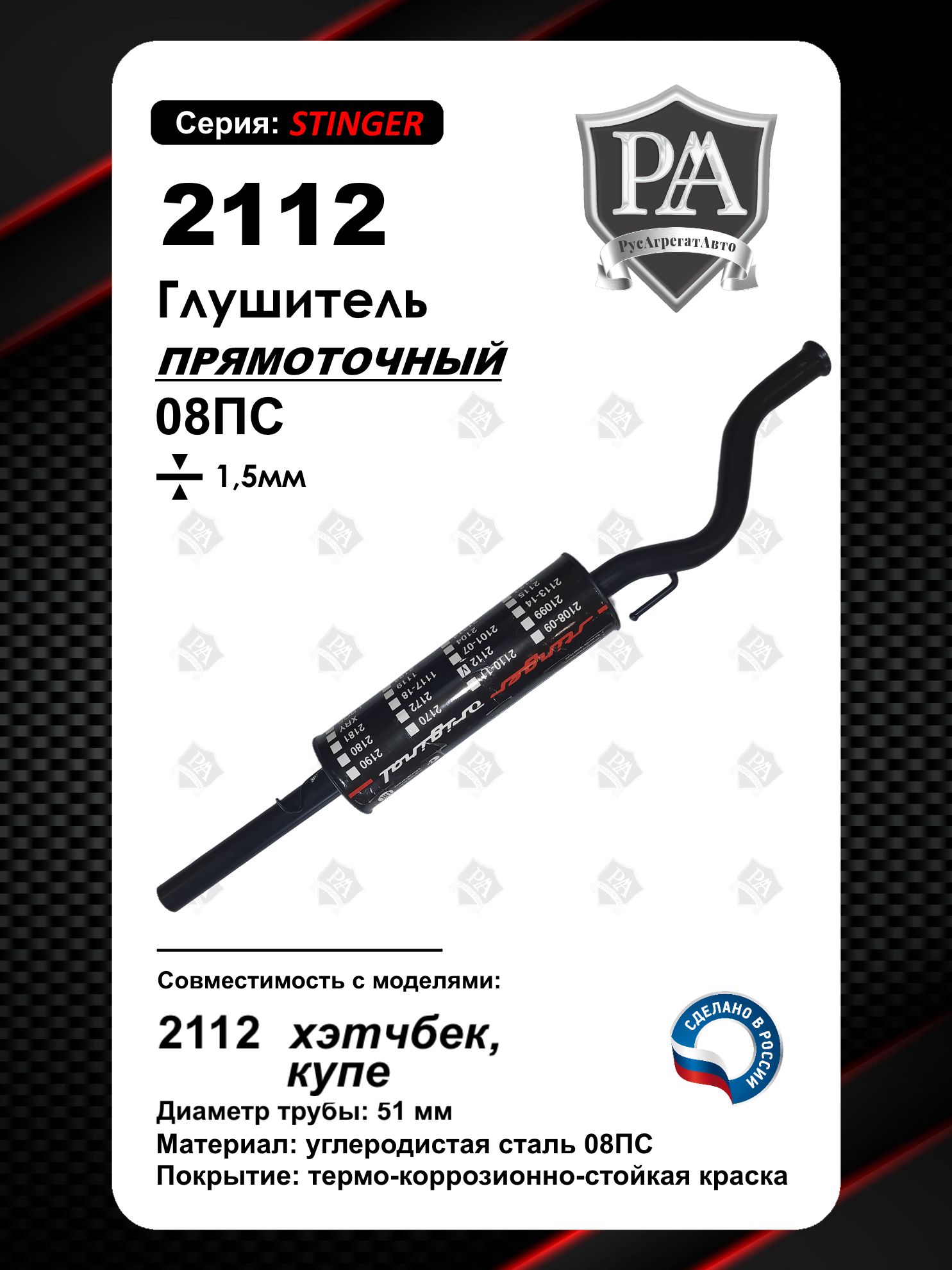 Глушитель прямоточный РусАгрегатАвто серия Stinger на автомобиль 2112 хэтчбек\nПреимущества наших глушителей:\n- контроль качества отк на каждом этапе\n- геометрия\n- акустика\n- сталь и труба по гост\n- герметичность\n- окраска\nСовместимость: ВАЗ 2112 хэтчбек\nБочок линейки «СТИНГЕР» имеет механическую закатку на промышленном оборудовании, что в отличие от сварного образца имеет более долгий срок эксплуатации и имеет высокую стойкость к механическим воздействиям в условиях агрессивной среды.\nКонструкция бочка включает в себя две перегородки, что делает его трехкамерным и повышает и повышает жесткость самого бочка. В последствии именно благодаря этой конструкции удалось срезать диапазон высоких частот, что делает звук выхлопа очень приятным для ушей.\nСборка глушителей производится на заводе, соблюдая техпроцесс и проходит проверку качества ОТК по геометрии, сварочным швам и порошковой окраске.\nМеталл для сборки глушителя используется толщиной 1.35мм согласно ГОСТ используемых материалов для выхлопных систем.\nПри проектировании учитывались такие задачи:\n- Долговечность использования без изменения звуковых характеристик.\n- Ценовая доступность.\n- Качество продукции.