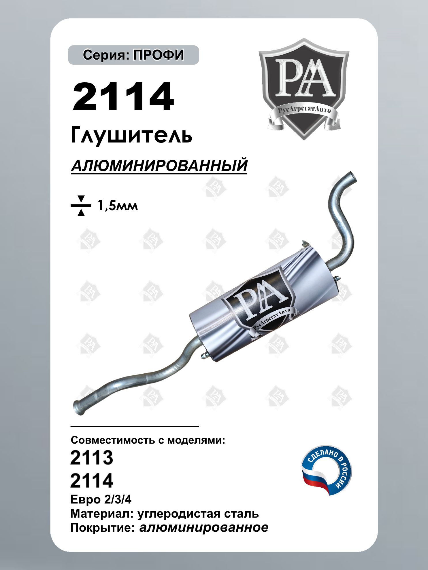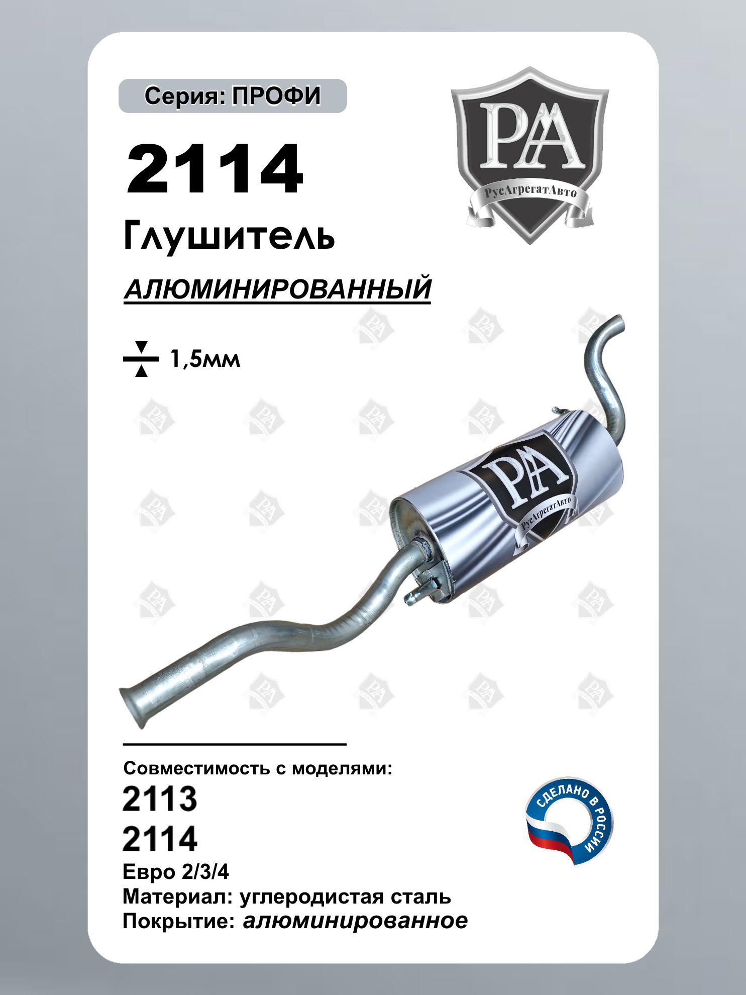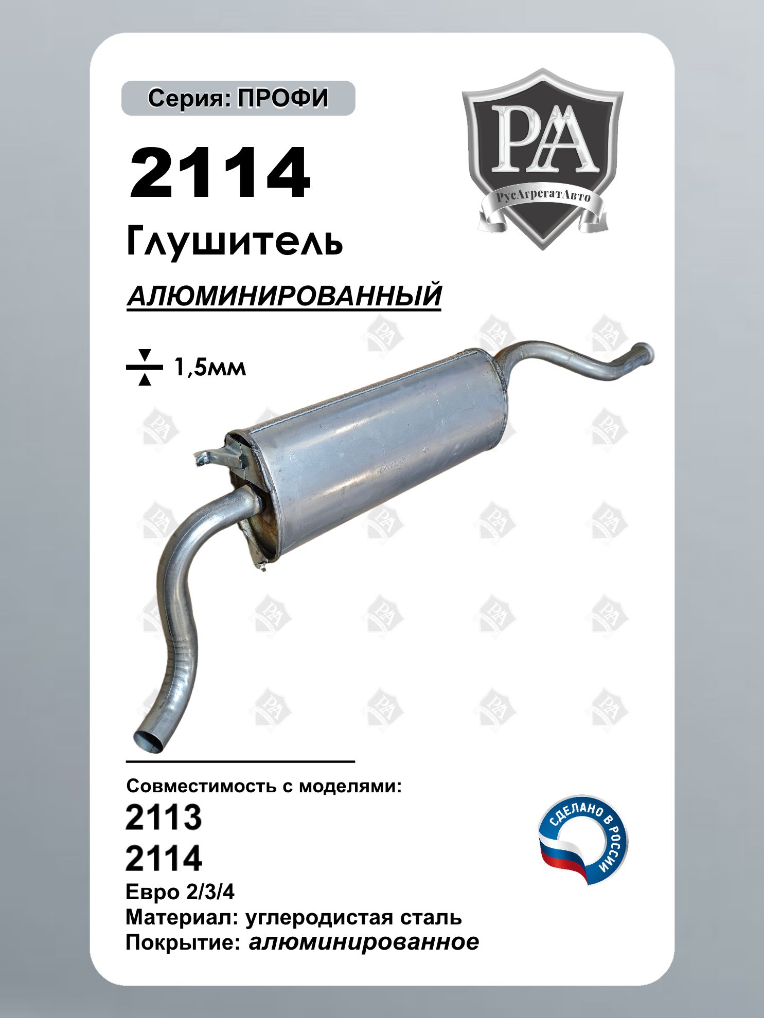 3-камерный Глушитель РусАгрегатАвто из алюминированной (алюминизированной) стали серия ПРОФИ для 2113, 2114 Конструкция обеспечивает тихую работу выхлопной системы при сохранении заводских параметров установки. Ключевые преимущества: 3-камерная система – эффективное шумопоглощение Точная заводская геометрия – установка на штатные места без доработок Усиленная конструкция – из Алюминированная сталь толщиной 1.5 мм Точная заводская геометрия – установка без доработок Технические характеристики:- Совместим с ВАЗ 2113, ВАЗ 2114- Тип: основной глушитель - Конструкция: 3-камерный, запатентованный узел - Материал: Алюминированная сталь толщиной 1.5 мм - Идеальная совместимость – точное повторение заводского агрегата Сделано в России