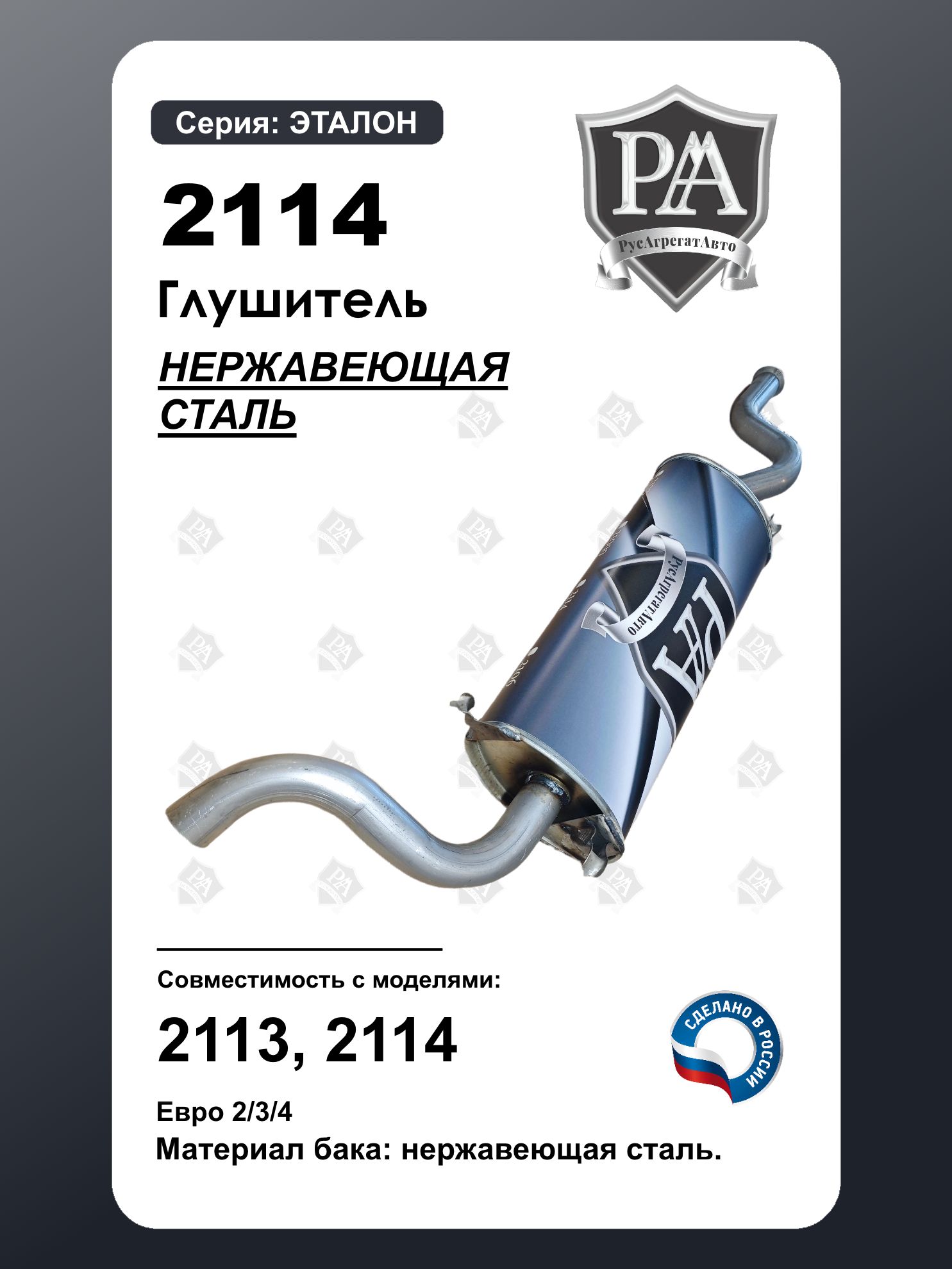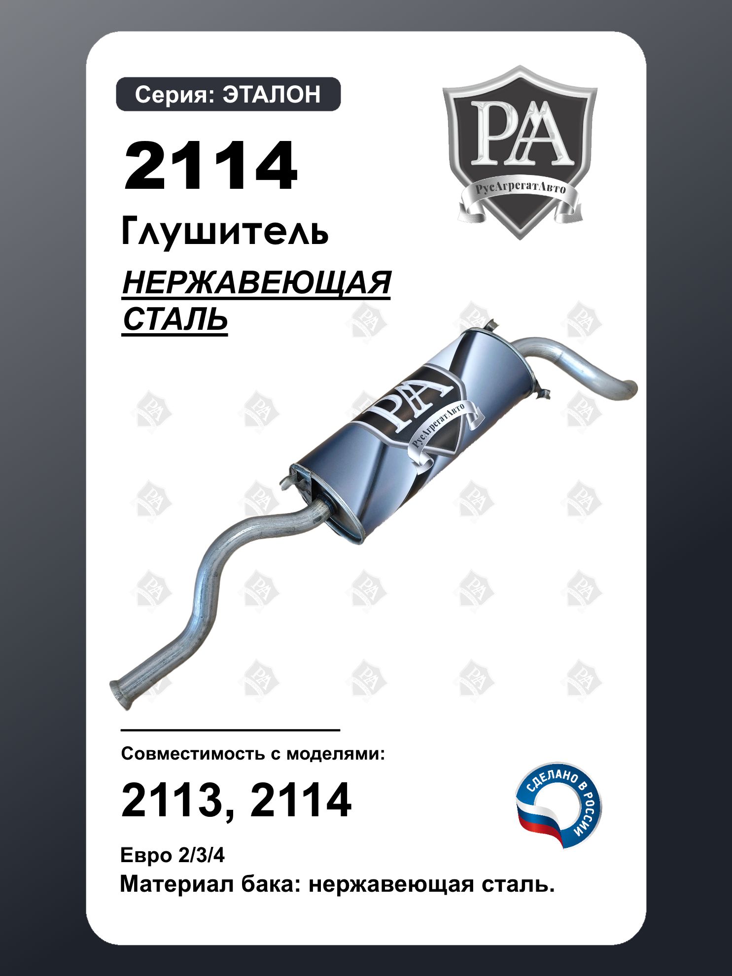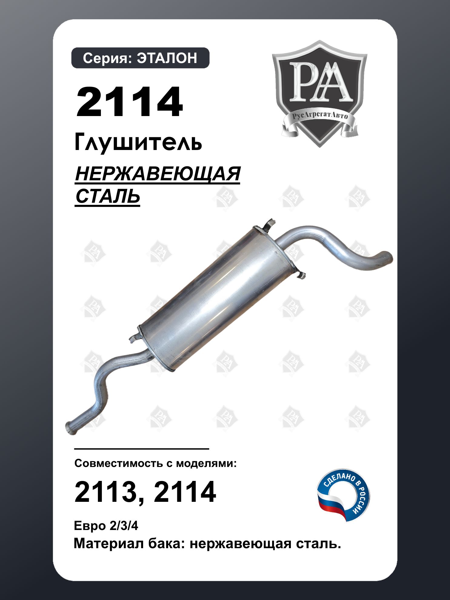 Глушитель основной РусАгрегатАвто из нержавеющей стали серия ЭТАЛОН для 2113, 2114\nОригинальное качество – разработан по заводским стандартам, как на конвейере, без упрощений и удешевления.\nУлучшенная конструкция – дополнительные перфорированные трубы для эффективного снижения шума и вибраций.\nЗащита от коррозии – впускная и выпускная трубы из алюминиевого сплава (прочнее и долговечнее, чем сталь 08пс в дешёвых аналогах).\nКорпус AISI 439 нержавеющая сталь – для повышенной стойкости к агрессивным воздействиям.\nИдеальная посадка – точные геометрические параметры для быстрой установки без доработок.\nНадёжность, проверенная временем – как у оригинала!\nСовместим с ВАЗ 2113, ВАЗ 2114\nСделано в России