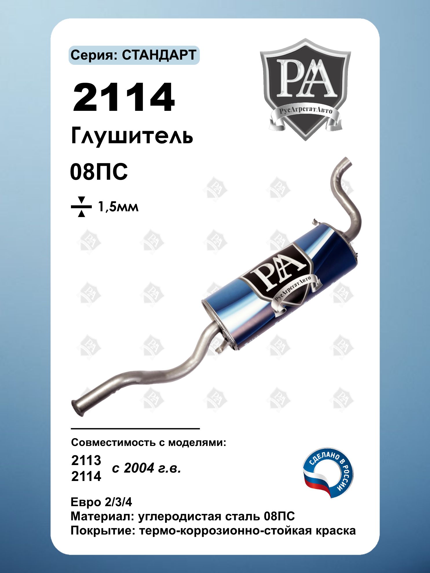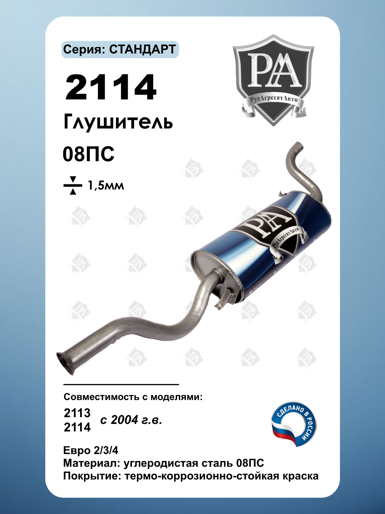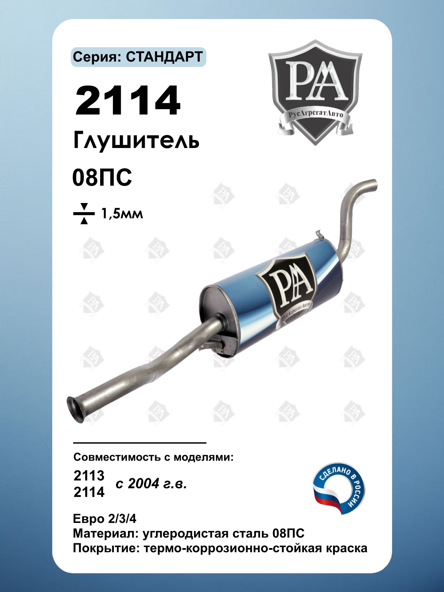 3-камерный Глушитель РусАгрегатАвто серии СТАНДАРТ для 2113, 2114 Конструкция обеспечивает тихую работу выхлопной системы при сохранении заводских параметров установки. Ключевые преимущества: 3-камерная система – эффективное шумопоглощение Точная заводская геометрия – установка на штатные места без доработок Усиленная конструкция – сталь 1.5 мм Изготовлен из углеродистой стали 08ПС Точная заводская геометрия – установка без доработок\nТехнические характеристики: - Совместим с ВАЗ 2113, ВАЗ 2114 (Самара) - Тип: основной глушитель - Конструкция: 3-камерный, запатентованный узел - Материал: сталь 1,5 мм (РФ) - Идеальная совместимость – точное повторение заводского агрегата Сделано в России