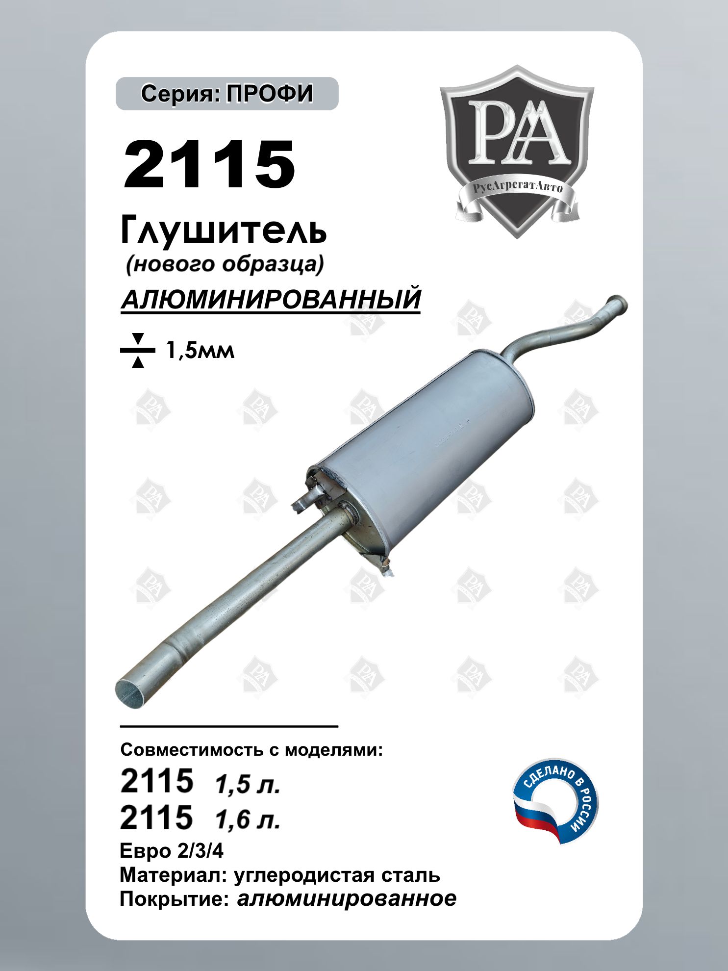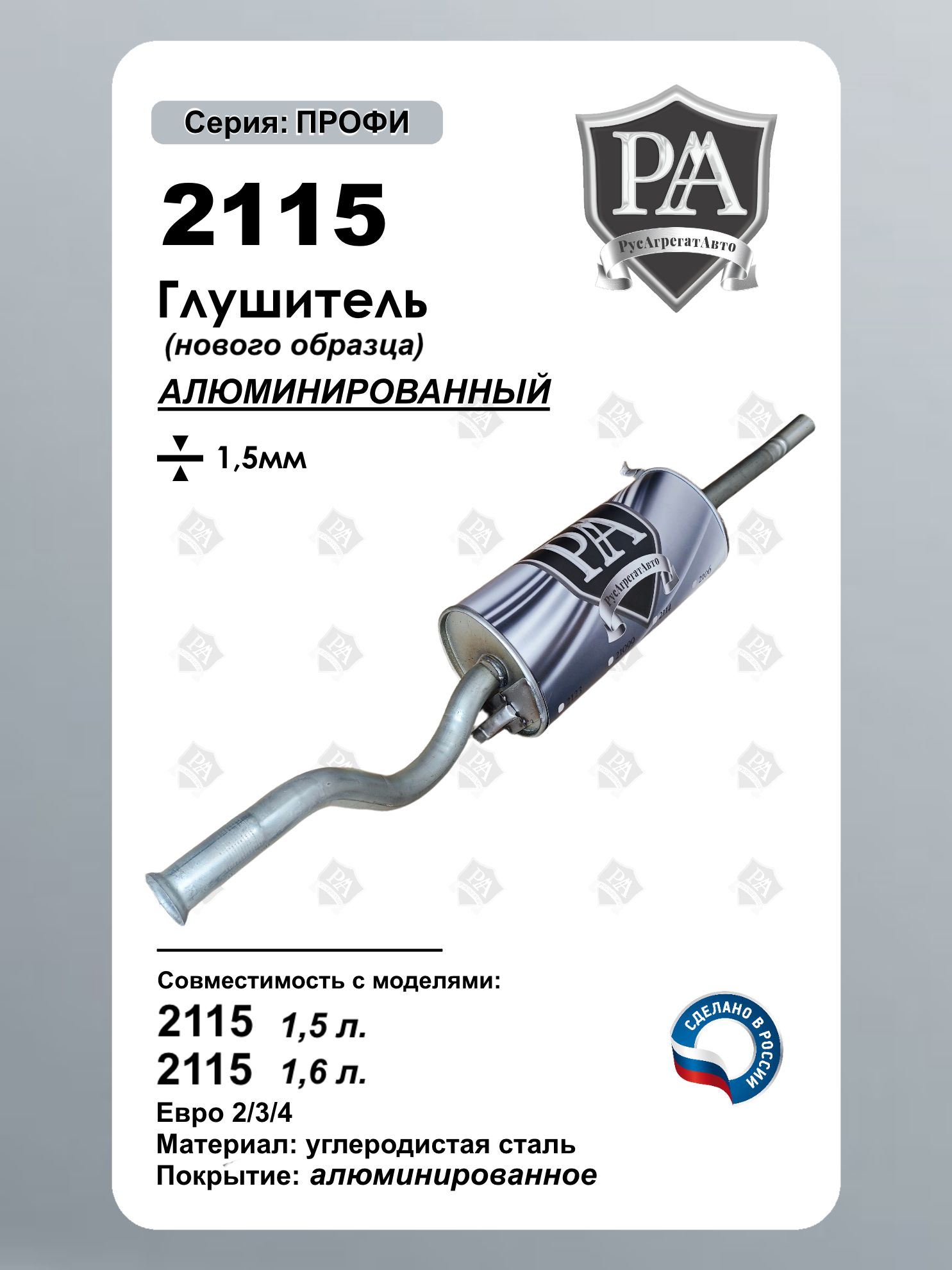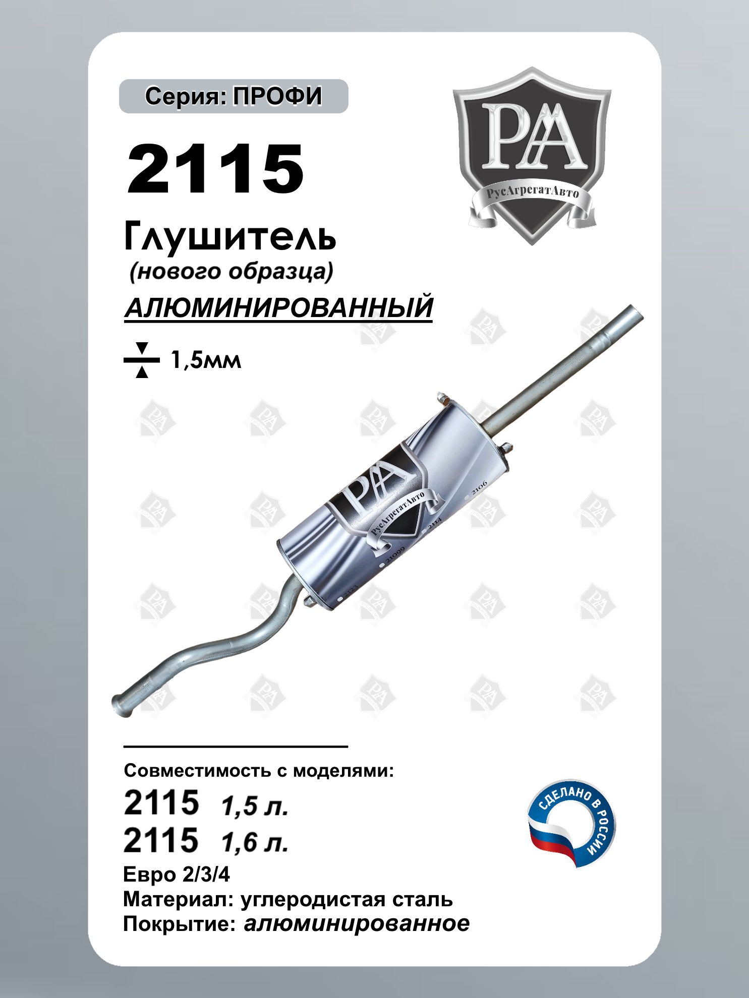 Глушитель РусАгрегатАвто из алюминированной (алюминизированной) стали серия ПРОФИ для 2115 нового образца Изготовлен с соблюдением всех заводских стандартов, обеспечивает тихую работу выхлопной системы и долговечность даже при интенсивной эксплуатации. nКлючевые преимущества: Полное соответствие оригиналу – точная геометрия для легкой установки – без доработок и подгонок Усиленная конструкция – Алюминированная сталь толщиной 1,5 мм Корпус закатный, 3-х камерный. Эффективное шумопоглощение – комфорт в салоне Гарантия надежности – устойчивость к коррозии и перепадам температур Совместим с ВАЗ 2115 Сделано в России