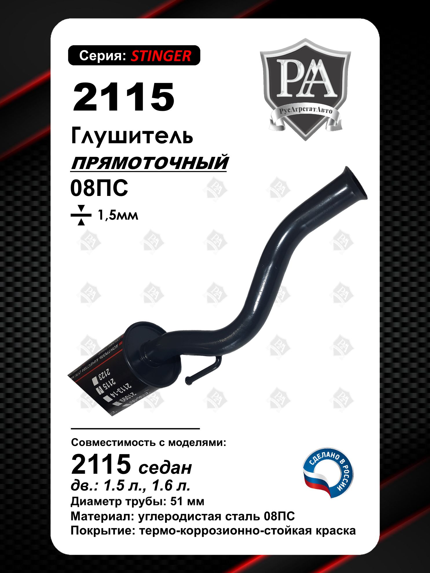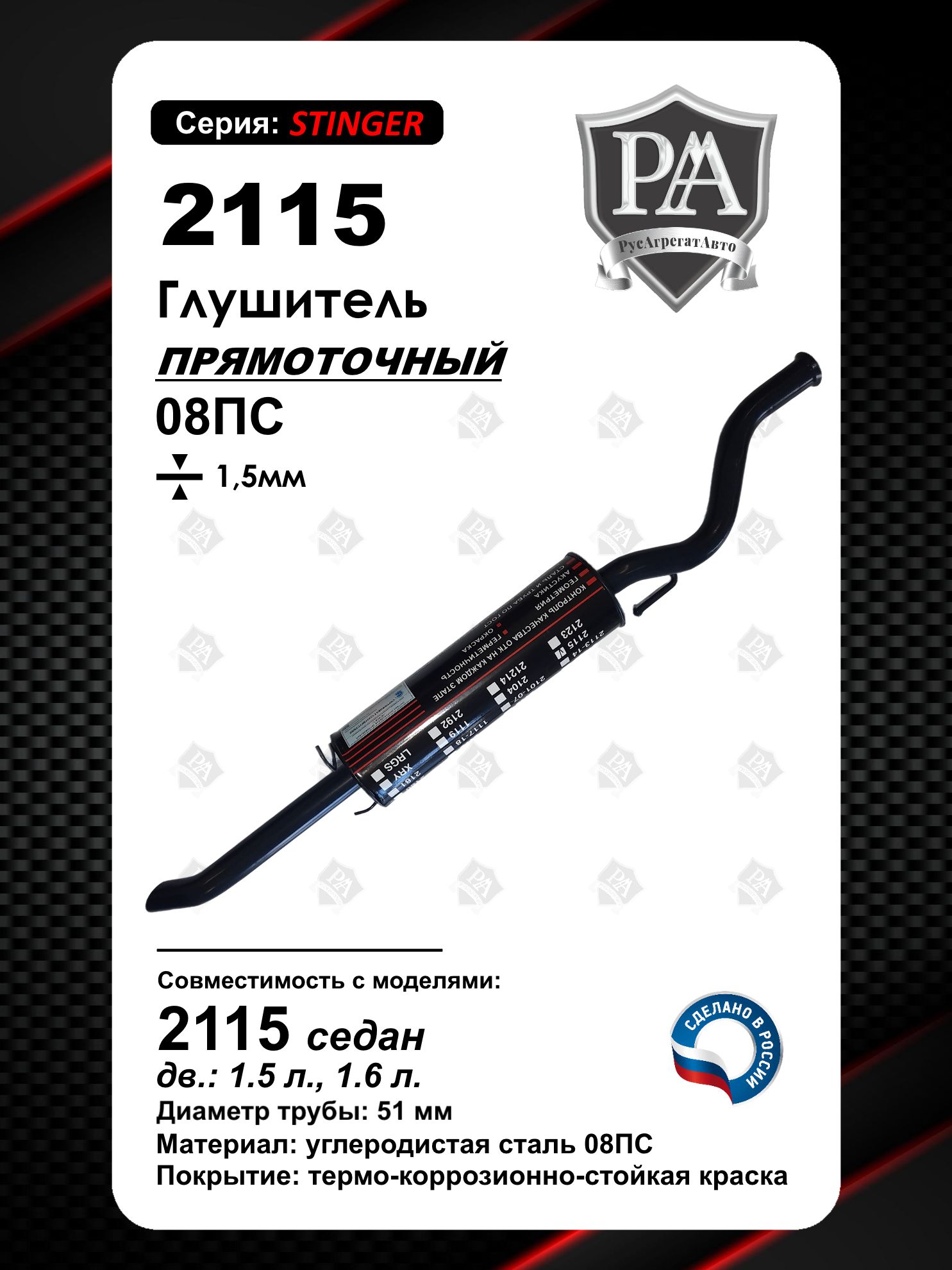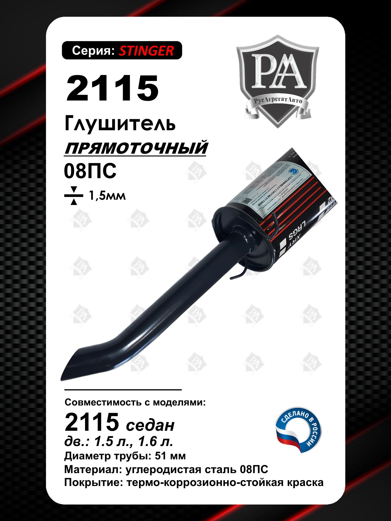 Глушитель прямоточный РусАгрегатАвто серия Stinger на автомобиль 2115\nПреимущества наших глушителей:\n- контроль качества отк на каждом этапе\n- геометрия\n- акустика\n- сталь и труба по гост\n- герметичность\n- окраска\nБочок линейки «СТИНГЕР» имеет механическую закатку на промышленном оборудовании, что в отличие от сварного образца имеет более долгий срок эксплуатации и имеет высокую стойкость к механическим воздействиям в условиях агрессивной среды.\nКонструкция бочка включает в себя две перегородки, что делает его трехкамерным и повышает и повышает жесткость самого бочка. В последствии именно благодаря этой конструкции удалось срезать диапазон высоких частот, что делает звук выхлопа очень приятным для ушей.\nСборка глушителей производится на заводе, соблюдая техпроцесс и проходит проверку качества ОТК по геометрии, сварочным швам и порошковой окраске.\nМеталл для сборки глушителя используется толщиной 1.35мм согласно ГОСТ используемых материалов для выхлопных систем.\nСовместим с ВАЗ 2115\nПри проектировании учитывалось такие задачи:\n- Долговечность использования без изменения звуковых характеристик.\n- Ценовая доступность.\n- Качество продукции.\nСделано в России