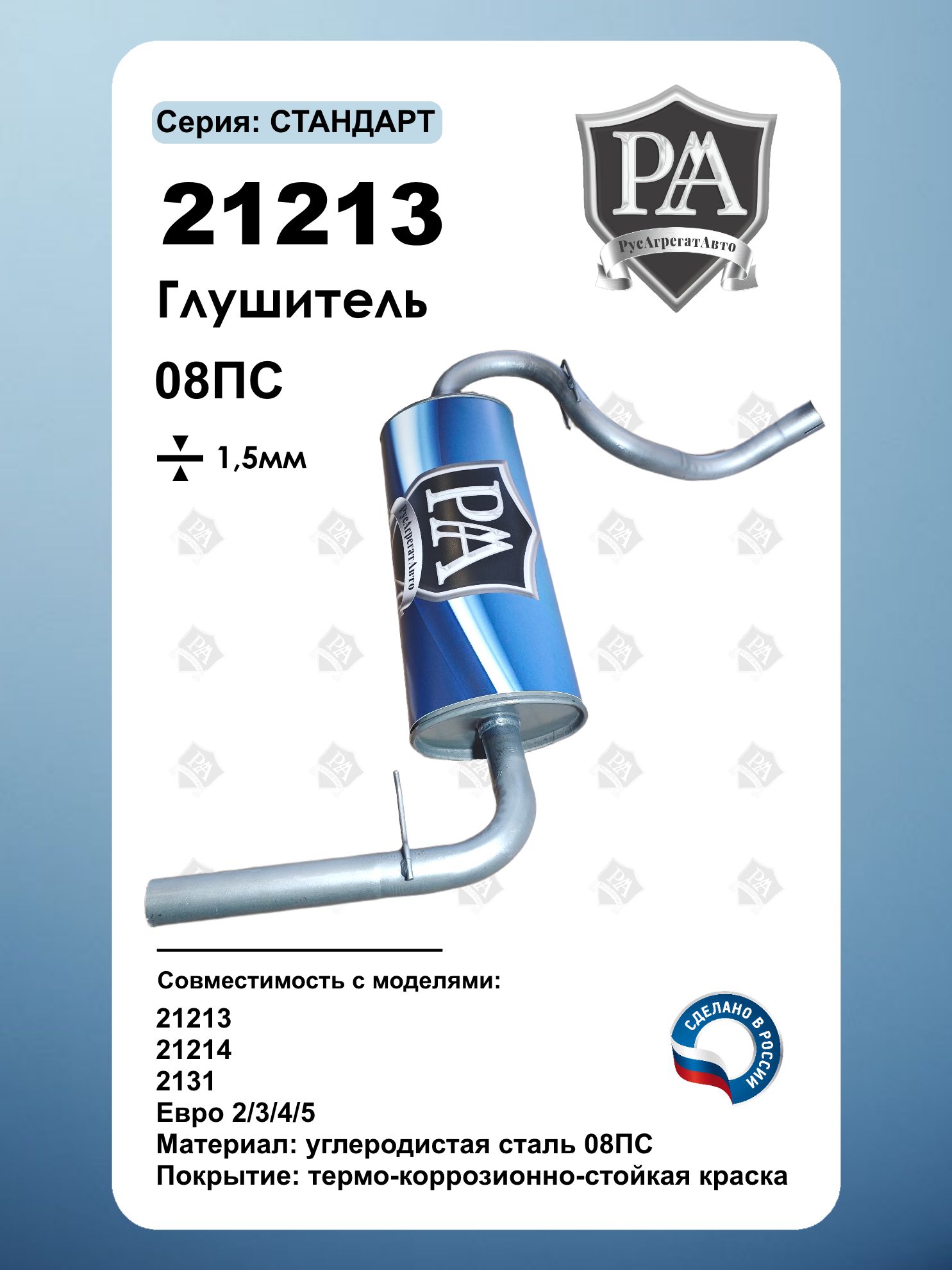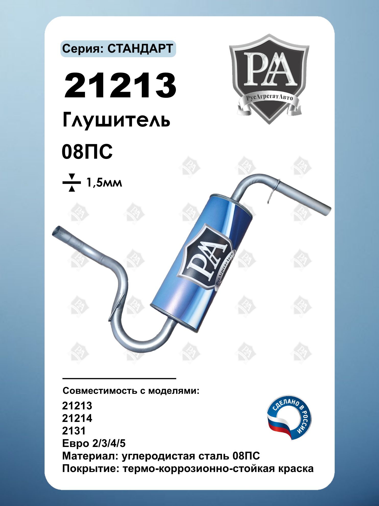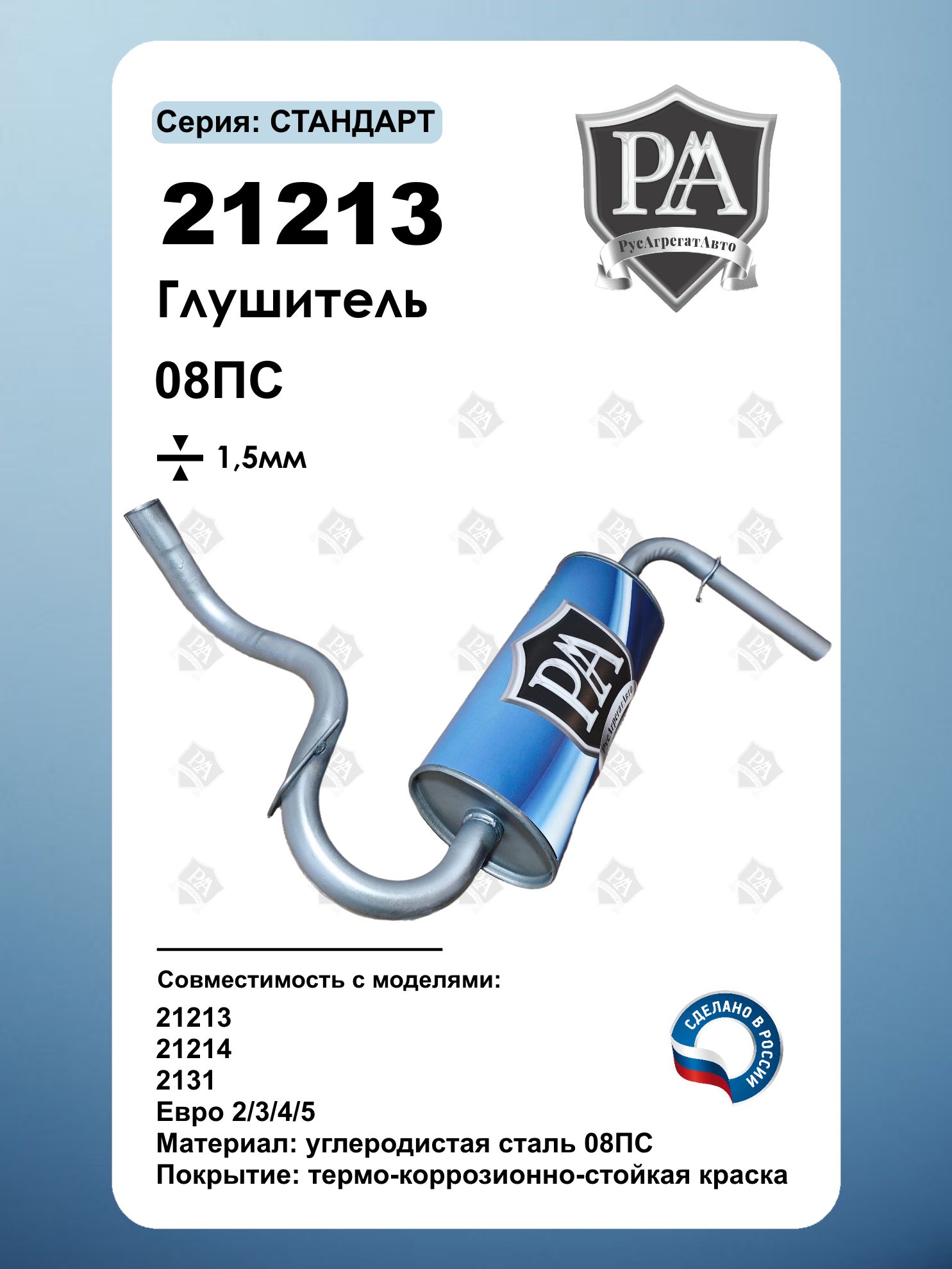 Глушитель РусАгрегатАвто серии СТАНДАРТ для 21213, 21214, 2131 Усиленная конструкция обеспечивает надежную работу в условиях бездорожья. Ключевые преимущества: Оптимизирован для карбюраторных двигателей Усиленная конструкция – сталь 1.5 мм Изготовлен из углеродистой стали 08ПС Точная заводская геометрия – установка без доработок Точная геометрия - соответствует заводским стандартам Сделано в России Совместим с ВАЗ 21213/21214/2131 НИВА, Нива Легенд