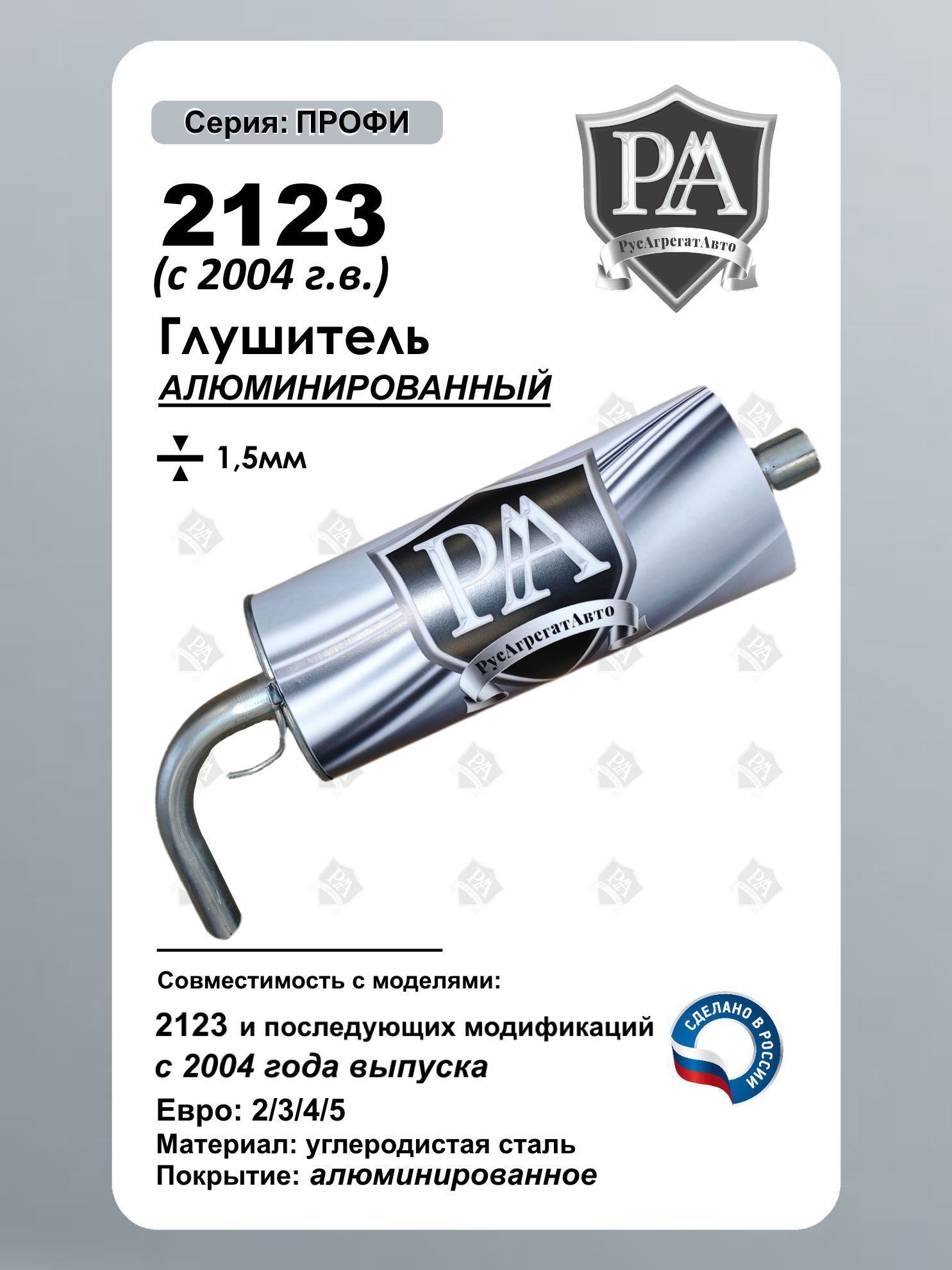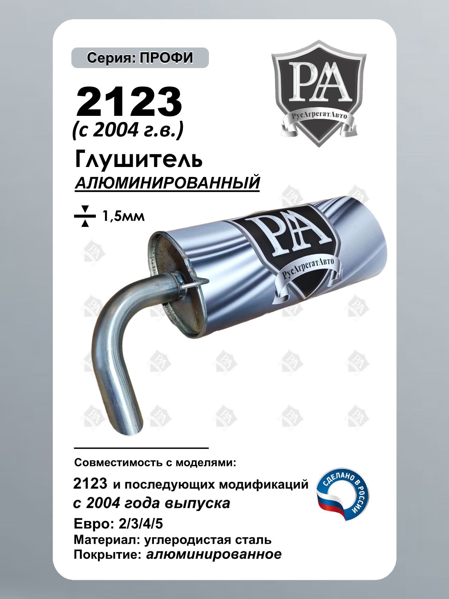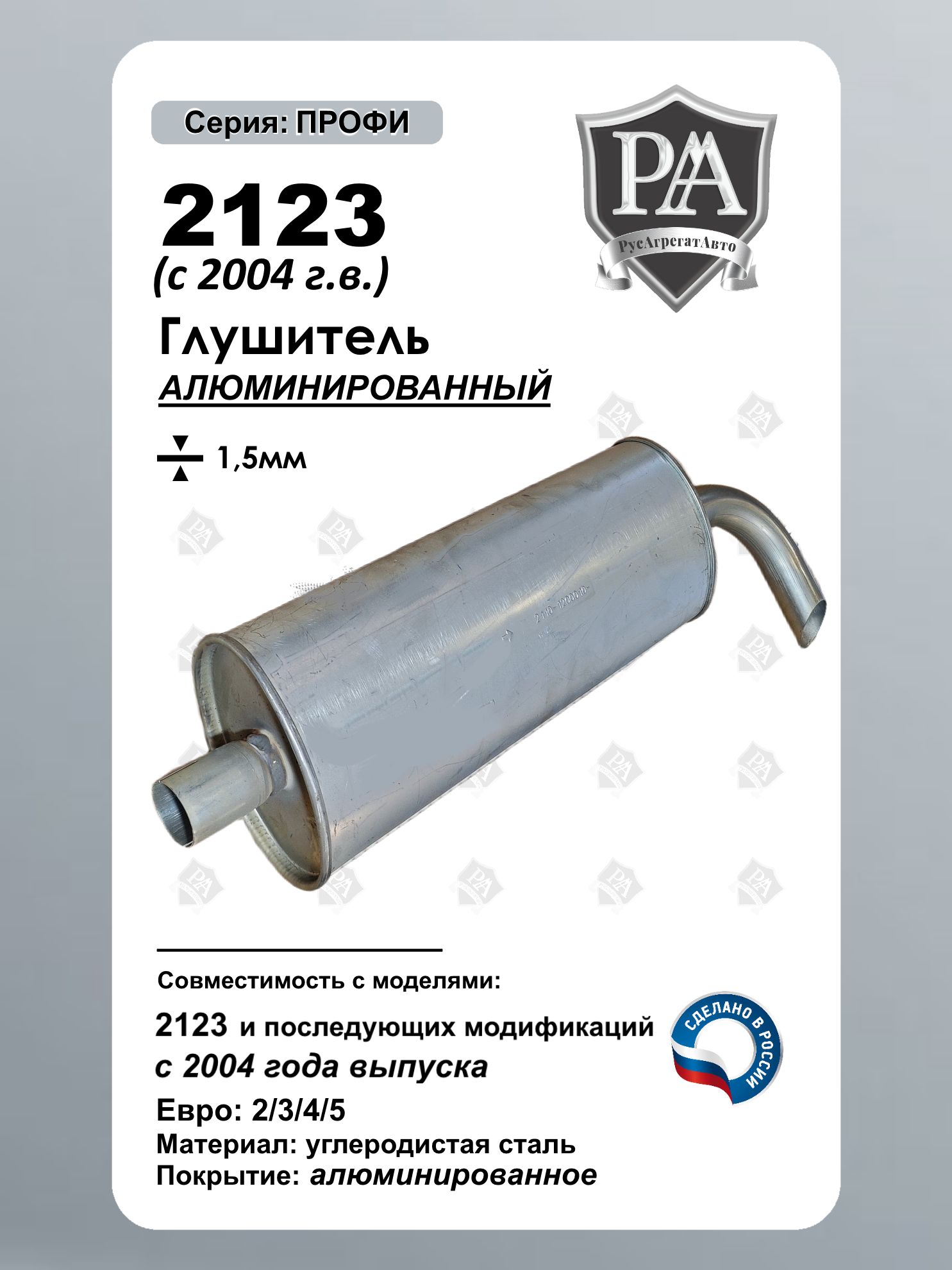Глушитель РусАгрегатАвто из алюминированной (алюминизированной) стали серия ПРОФИ нового образца устанавливаются на автомобиль 2123, 2131 с 2004 года выпуска – это надежная замена штатного элемента выхлопной системы. Материал: Алюминированная сталь толщиной 1,5 мм Толщина металла: 1,5 мм (обеспечивает долговечность). Геометрия: полностью соответствует заводскому глушителю. Установка: на штатные места крепления (без доработок). Форма: круглый бак (новый образец на автомобиль с 2004 года). Совместим для моделями ВАЗ 2123, ВАЗ 2131 с 2004 г.в. Шевроле Нива, Chevrolet Niva Сделано в России
