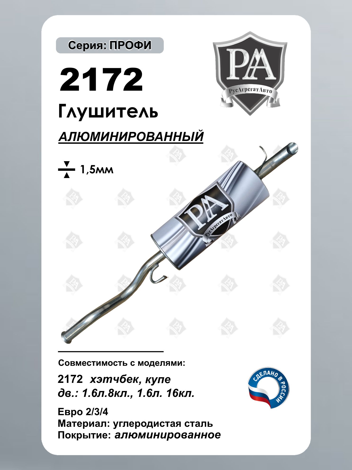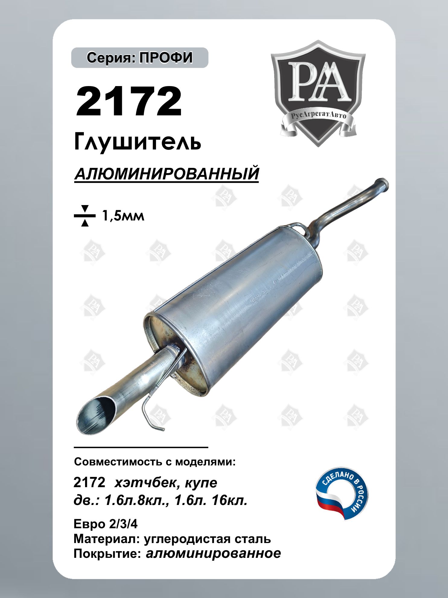 Глушитель РусАгрегатАвто из алюминированной (алюминизированной) стали серия ПРОФИ для 2172 хэтчбек ь и долговечность эксплуатации. Ключевые преимущества: Усовершенствованная 3-камерная система с запатентованным внутренним узлом для максимального снижения шума Материал: Алюминированная сталь толщиной 1,5 мм Геометрия: полностью соответствует заводскому глушителю. Установка: на штатные места крепления (без доработок). Совместим с автомобилями ВАЗ Priora (Приора) Сделано в России