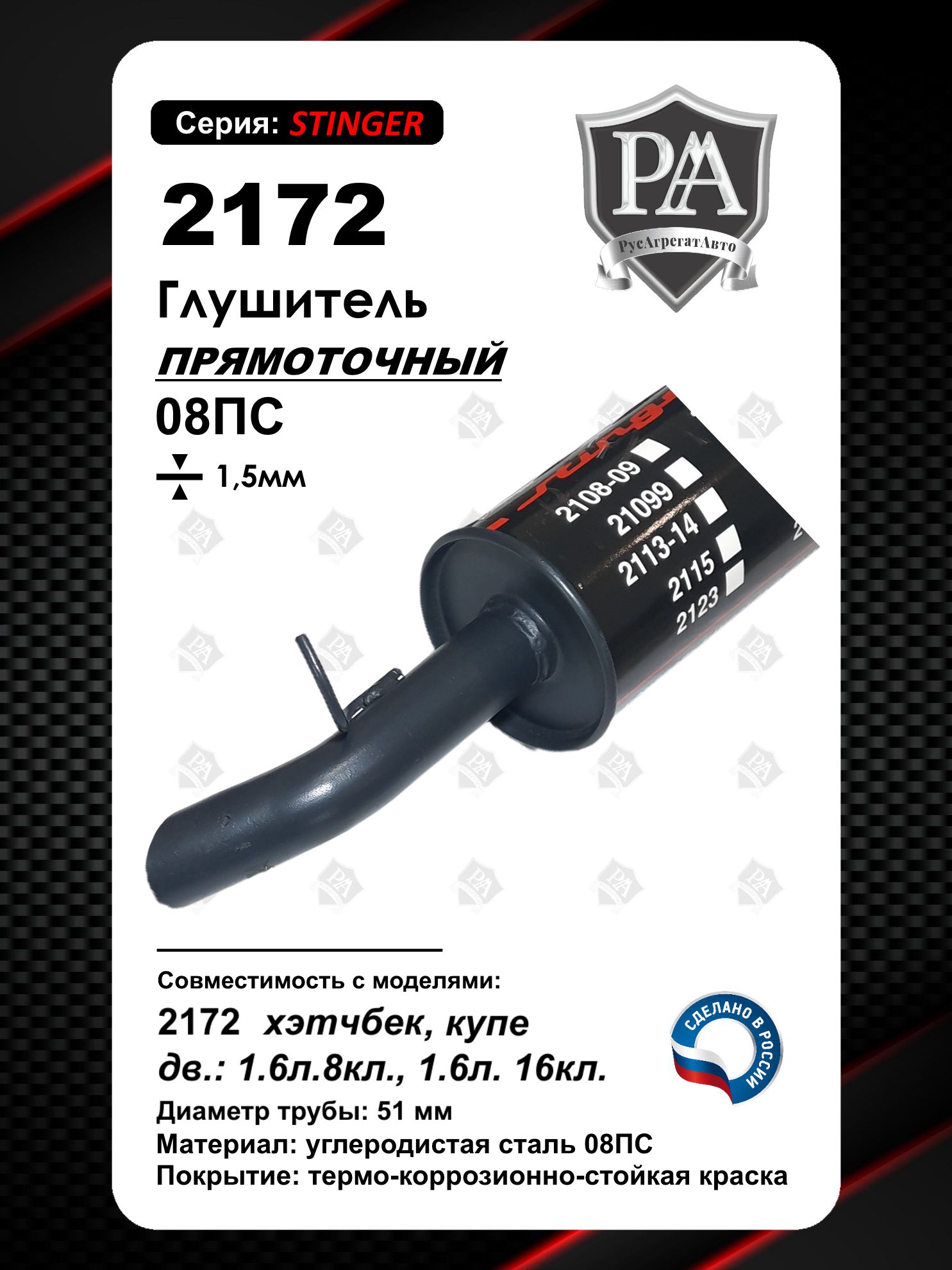 Глушитель прямоточный РусАгрегатАвто серия Stinger на автомобиль 2172 хэтчбек\nПреимущества наших глушителей:\n- контроль качества отк на каждом этапе\n- геометрия\n- акустика\n- сталь и труба по гост\n- герметичность\n- окраска\nСовместимость: ВАЗ 2172 Priora / Приора хэтчбек\nБочок линейки «СТИНГЕР» имеет механическую закатку на промышленном оборудовании, что в отличие от сварного образца имеет более долгий срок эксплуатации и высокую стойкость к механическим воздействиям в условиях агрессивной среды.\nКонструкция бочка включает в себя две перегородки, что делает его трехкамерным и повышает жесткость самого бочка. В последствии именно благодаря этой конструкции удалось срезать диапазон высоких частот, что делает звук выхлопа очень приятным для ушей.\nСборка глушителей производится на заводе, соблюдая техпроцесс и проходит проверку качества ОТК по геометрии, сварочным швам и порошковой окраске.\nМеталл для сборки глушителя используется толщиной 1.35мм согласно ГОСТ используемых материалов для выхлопных систем.\nПри проектировании учитывались такие задачи:\n- Долговечность использования без изменения звуковых характеристик.\n- Ценовая доступность.\n- Качество продукции.