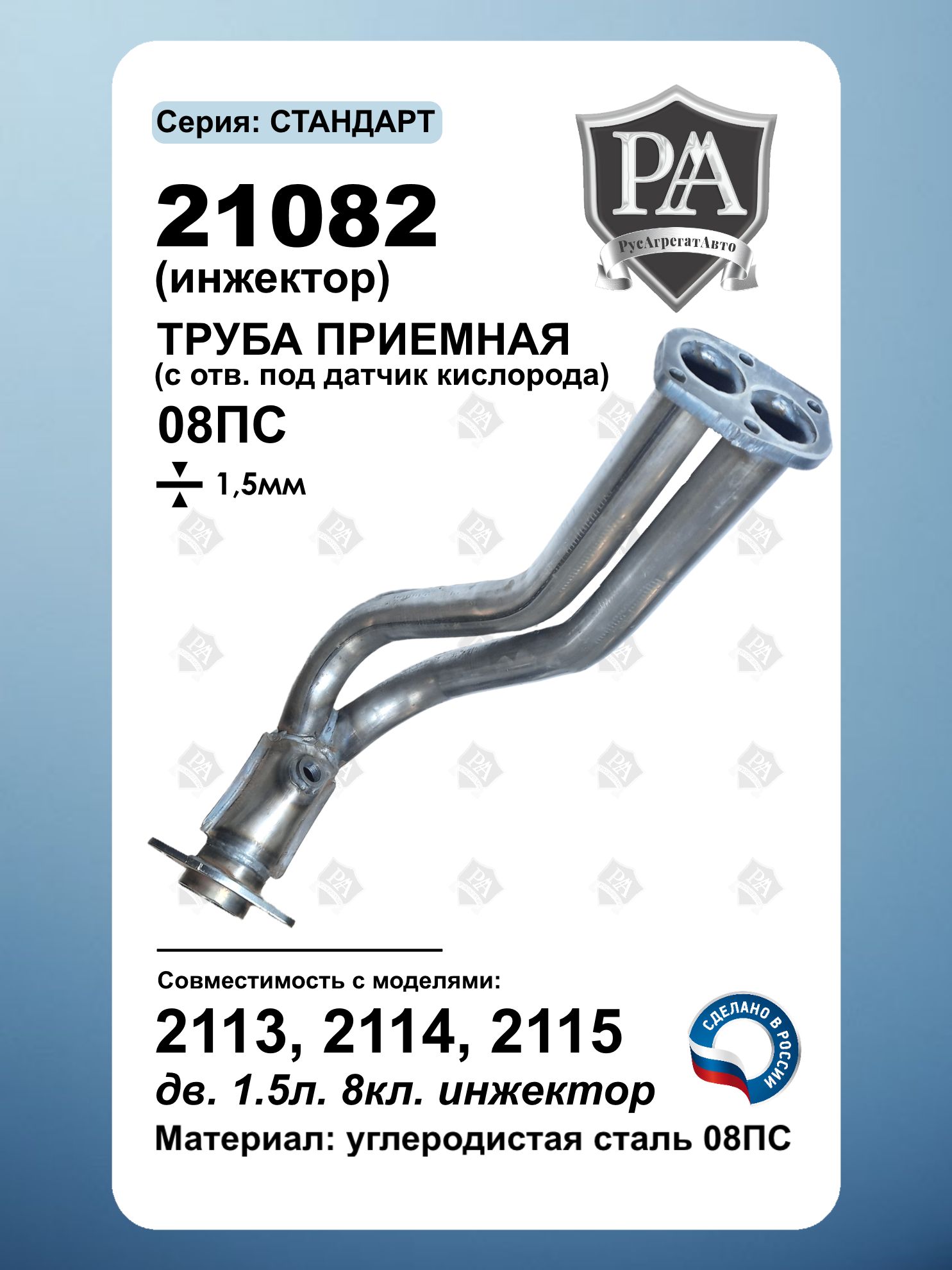 Приемная труба для 2113, 2114, 2115, а так же 2108, 2109, 21099, 2110, 2111, 2112 оснащенных инжекторным двигателем 1.5 л. 8 кл.\nЛегкая установка\nТруба изготовлена из прочного металла и устанавливается на штатные места крепления.\nСовместим с ВАЗ 2113, ВАЗ 2114, ВАЗ 2115\nМатериал и качество: Изготовлена из углеродистой стали 08ПС (толщина 1,5 мм). Соответствует заводским стандартам. Особенности: Обеспечивает надёжное соединение с выпускной системой. Оптимальная конструкция для бесперебойной работы глушителя. Подходит для замены штатной детали. Производитель: Идеальное решение для ремонта выхлопной системы вашего ВАЗ!\nЛёгкая установка – восстановите работоспособность выхлопной системы быстро и без лишних затрат!\nСделано в России