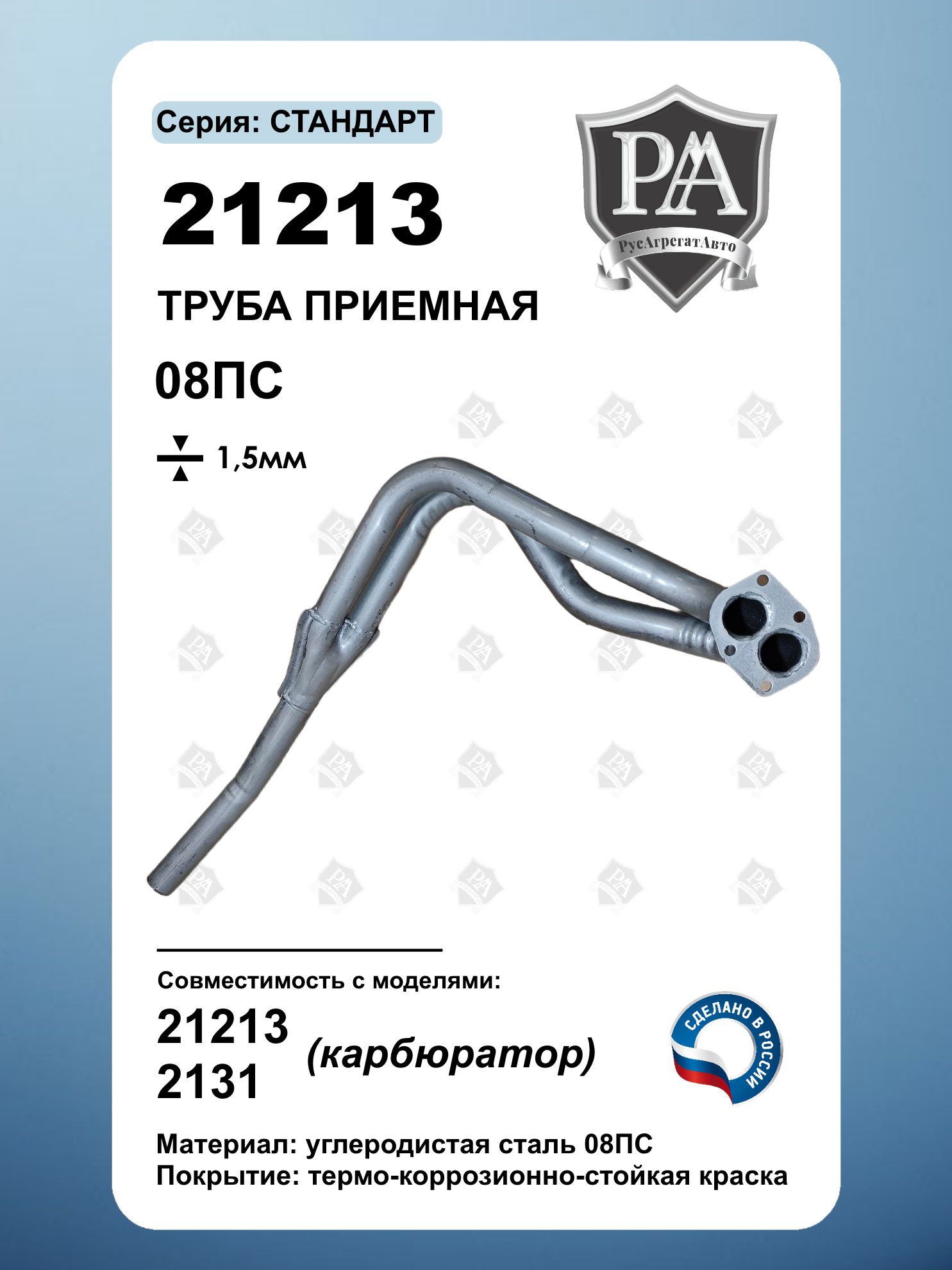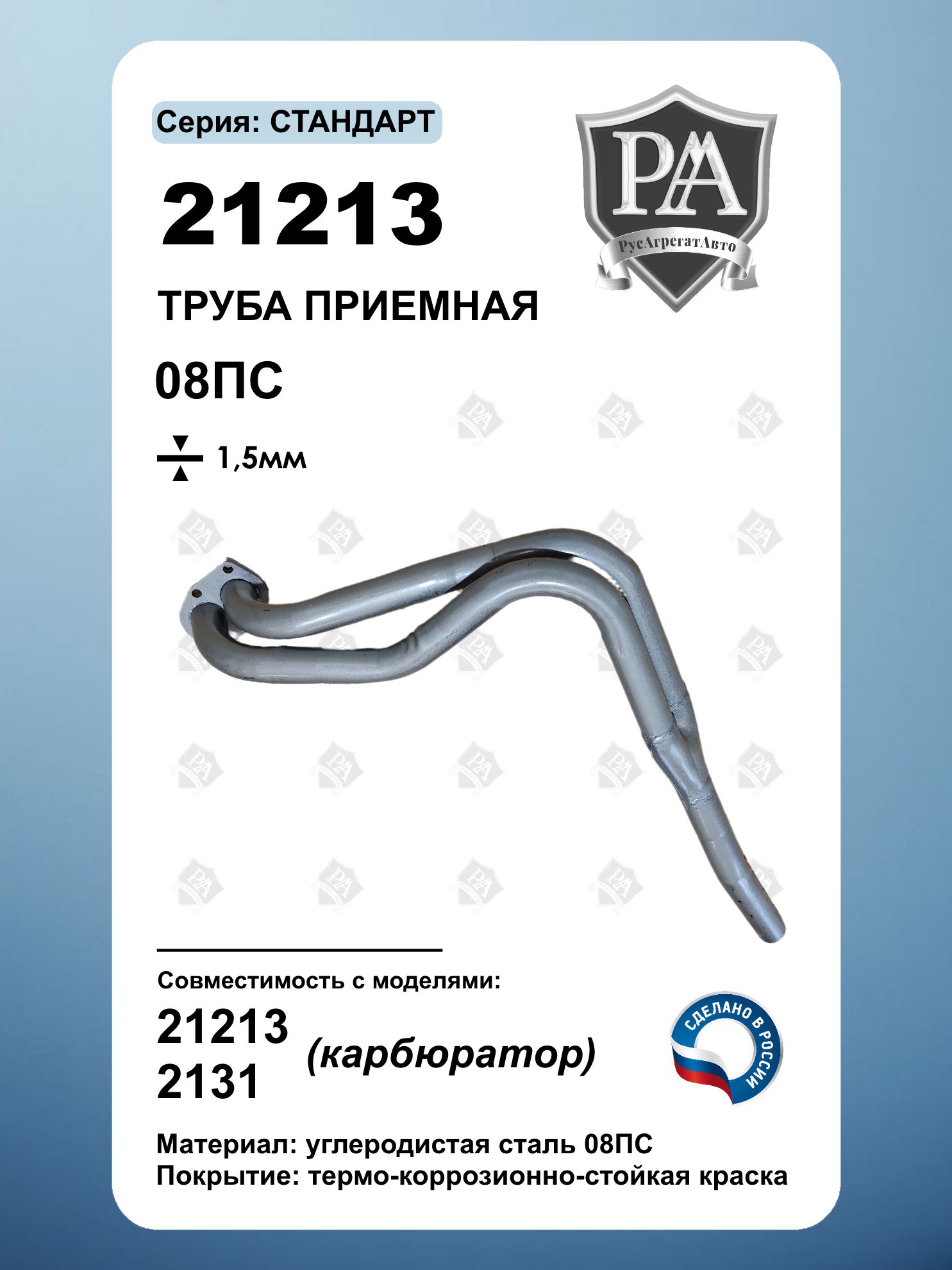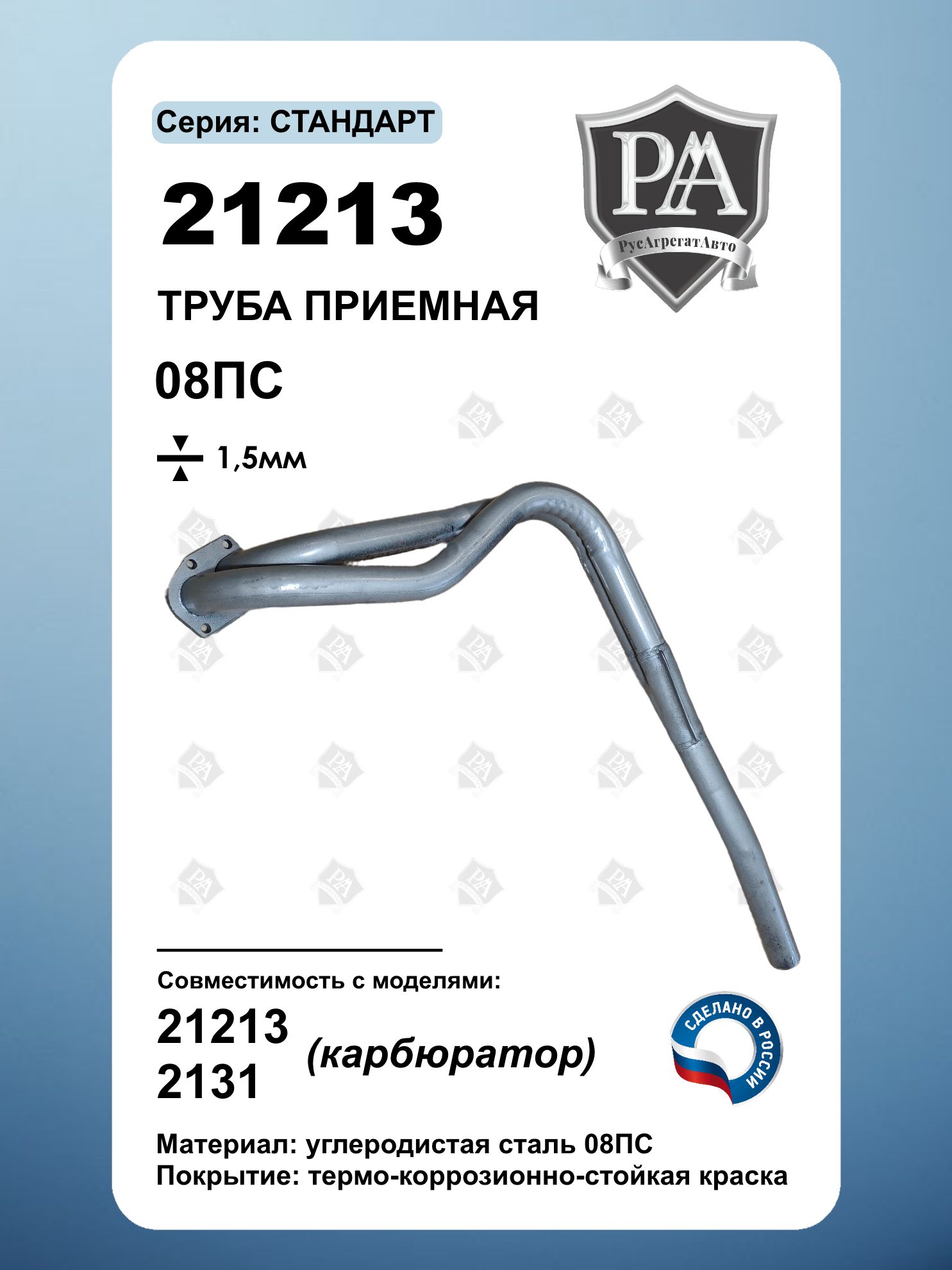 Приемная труба предназначена для автомобилей 21213 (карбюратор) и 2131 (карбюратор)\nПрочность и надежность Изготовлена из углеродистой стали 08ПС толщиной 1.5 мм Соответствует заводским стандартам. Особенности: Обеспечивает надёжное соединение с выпускной системой. Обеспечивает лучшую продувку выхлопных газов, что способствует стабильной работе двигателя. Подходит для замены штатной детали. Производитель: Идеальное решение для ремонта выхлопной системы вашего ВАЗ!\nЛёгкая установка – восстановите работоспособность выхлопной системы быстро и без лишних затрат!\nСделано в России\nСовместим с ВАЗ 21213/2131 НИВА, Нива Легенд