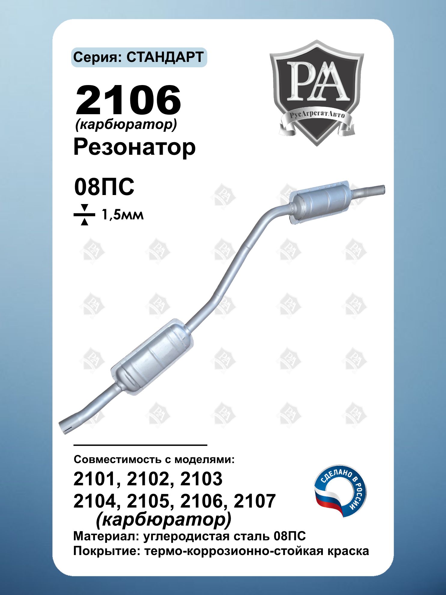 РезонатоРусАгрегатАвто серия СТАНДАРТ для автомобилей 2101-2107 (карбюратор) Идеальная посадка – устанавливается в штатное место без доработок, полностью соответствует заводской геометрии. Прочная конструкция – изготовлен из углеродистой стали 08ПС (1,5 мм), российское производство. Антикоррозийная защита – покрыт серебристой краской для увеличения срока службы. Совместим с ВАЗ 2101, ВАЗ 2102, ВАЗ 2103, ВАЗ 2104, ВАЗ 2105, ВАЗ 2106, ВАЗ 2107 с карбюраторным двигателем. Простота установки, долговечность и комфортная езда – выберите оригинальное качество! Гарантия тихой работы и надежности – без лишнего шума и коррозии! Сделано в России