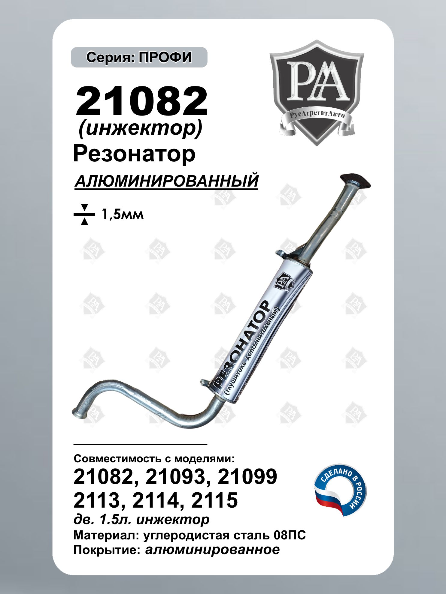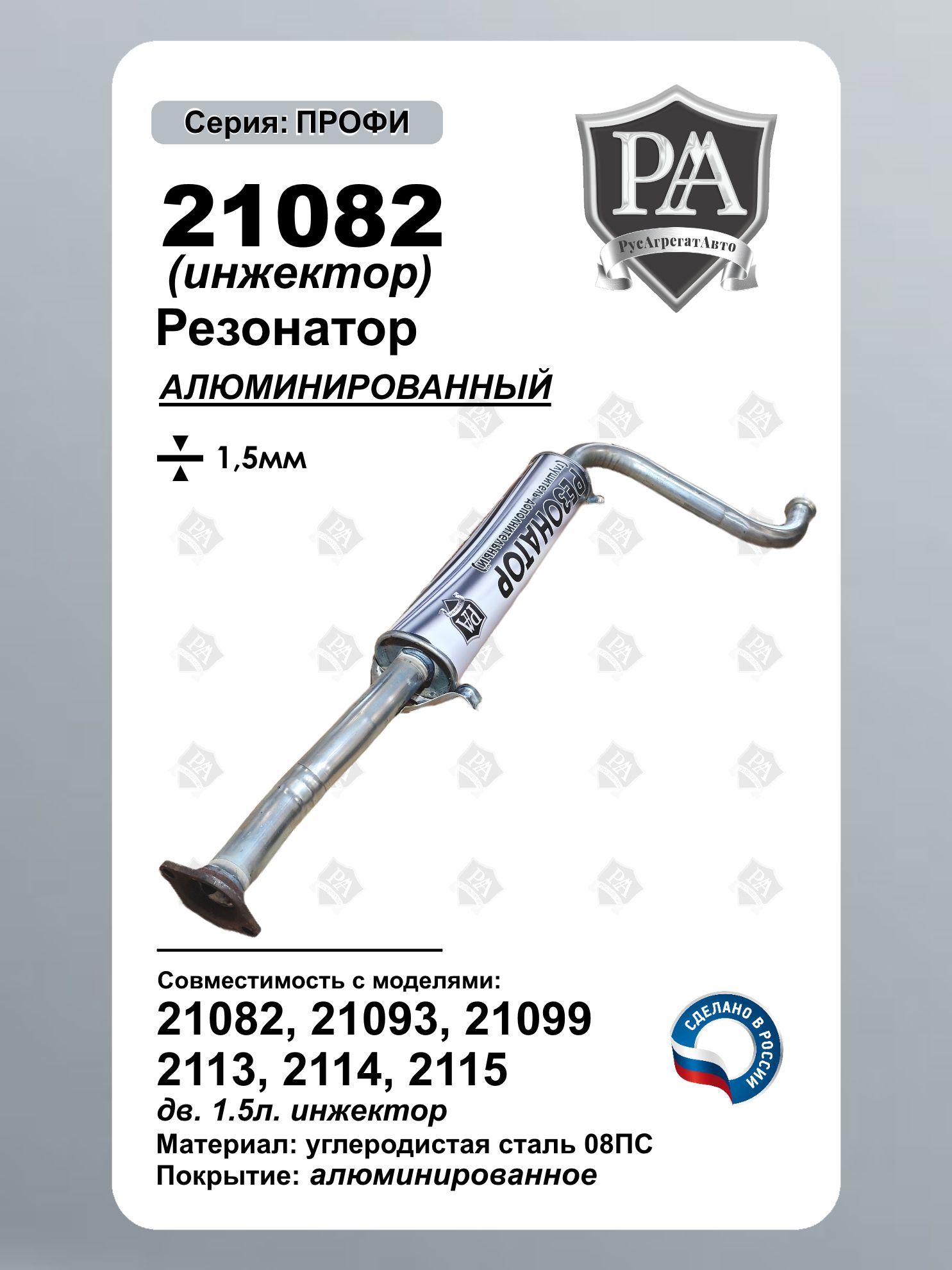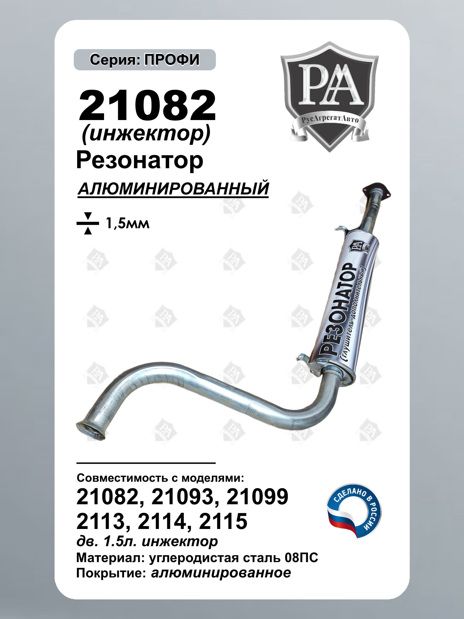 Резонатор 21082 РусАгрегатАвто из алюминированной (алюминизированной) стали серия ПРОФИ (дополнительный глушитель) для автомобилей 2108, 2113, 2114, 2115 с инжекторным двигателем 1.5 л (8 клапанов) Специально разработан для эффективного снижения шума и вибраций в выхлопной системе. Ключевые преимущества: Технология закатного корпуса - повышенная герметичность и срок службы Усовершенствованная 3-камерная система Материал: Алюминированная сталь толщиной 1,5 мм Точная заводская геометрия – установка без доработок Полное соответствие заводским стандартам - простая установка без доработок Совместим с ВАЗ 2108, ВАЗ 2113, ВАЗ 2114, ВАЗ 2115 Идеальная совместимость - точное соответствие штатным креплениям Сделано в России