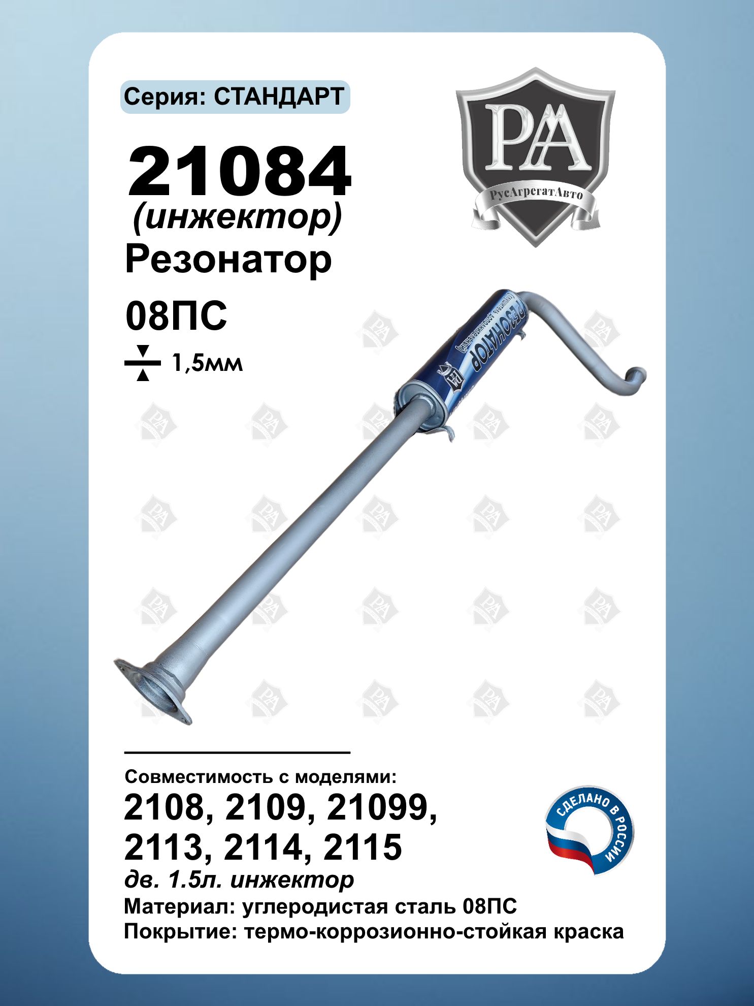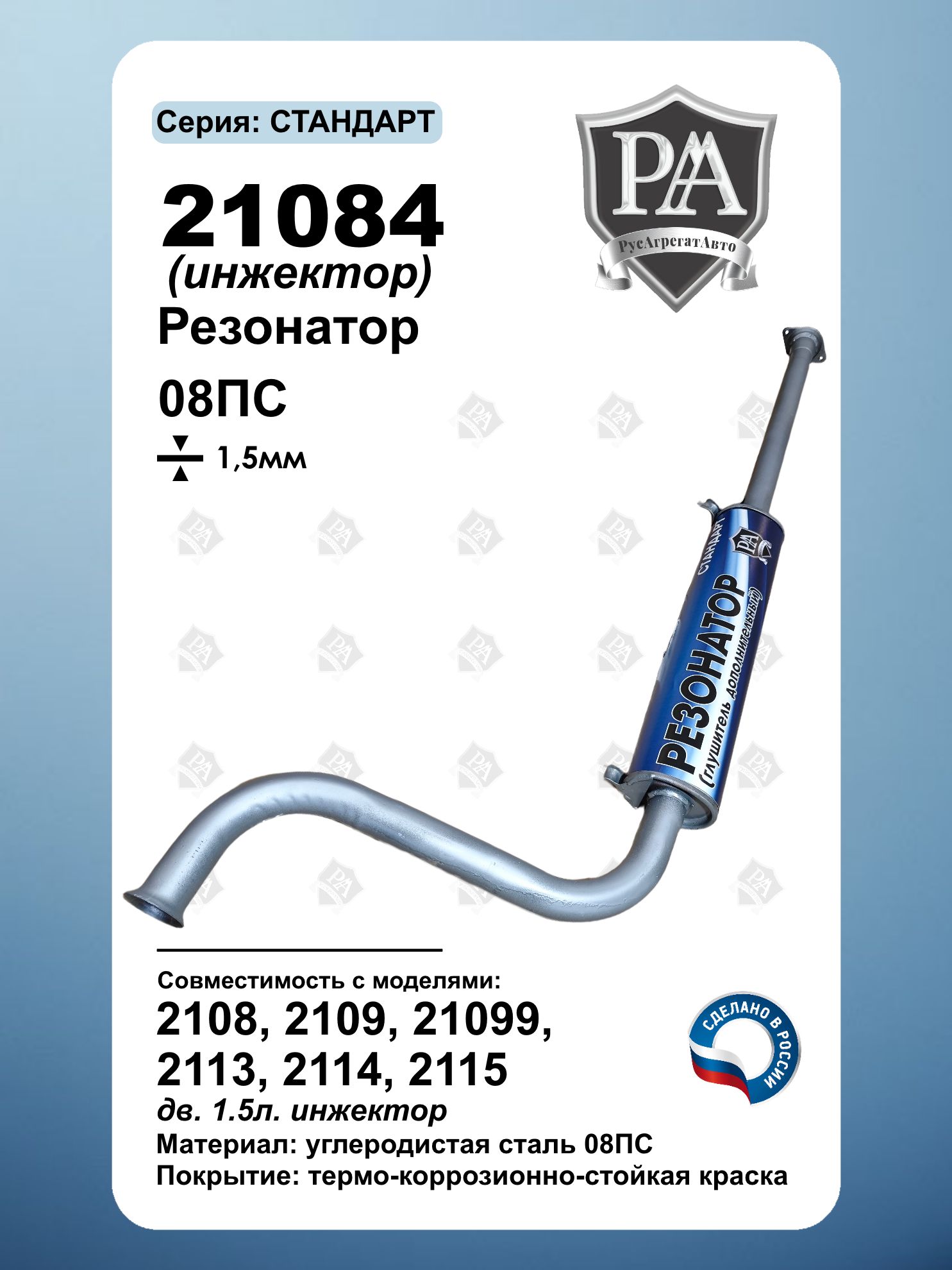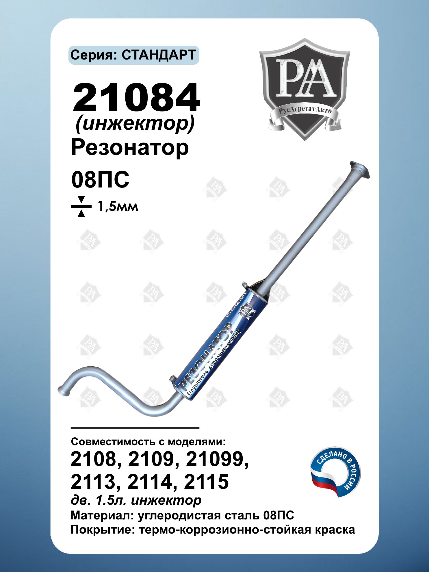 Резонатор 21084 РусАгрегатАвто серия СТАНДАРТ для автомобилей 2108, 2109, 21099, 2113, 2114, 2115 с инжекторным двигателем 1.5 л (8 клапанов) Специально разработан для эффективного снижения шума и вибраций в выхлопной системе. Ключевые преимущества: Совместим с ВАЗ 2108, ВАЗ 2109, ВАЗ 21099, ВАЗ 2113, ВАЗ 2114, ВАЗ 2115 Усиленная конструкция – сталь 1.5 мм Изготовлен из углеродистой стали 08ПС Точная заводская геометрия – установка без доработок Антикоррозийное покрытие для долговечности Точное соответствие заводским параметрам Сделано в России