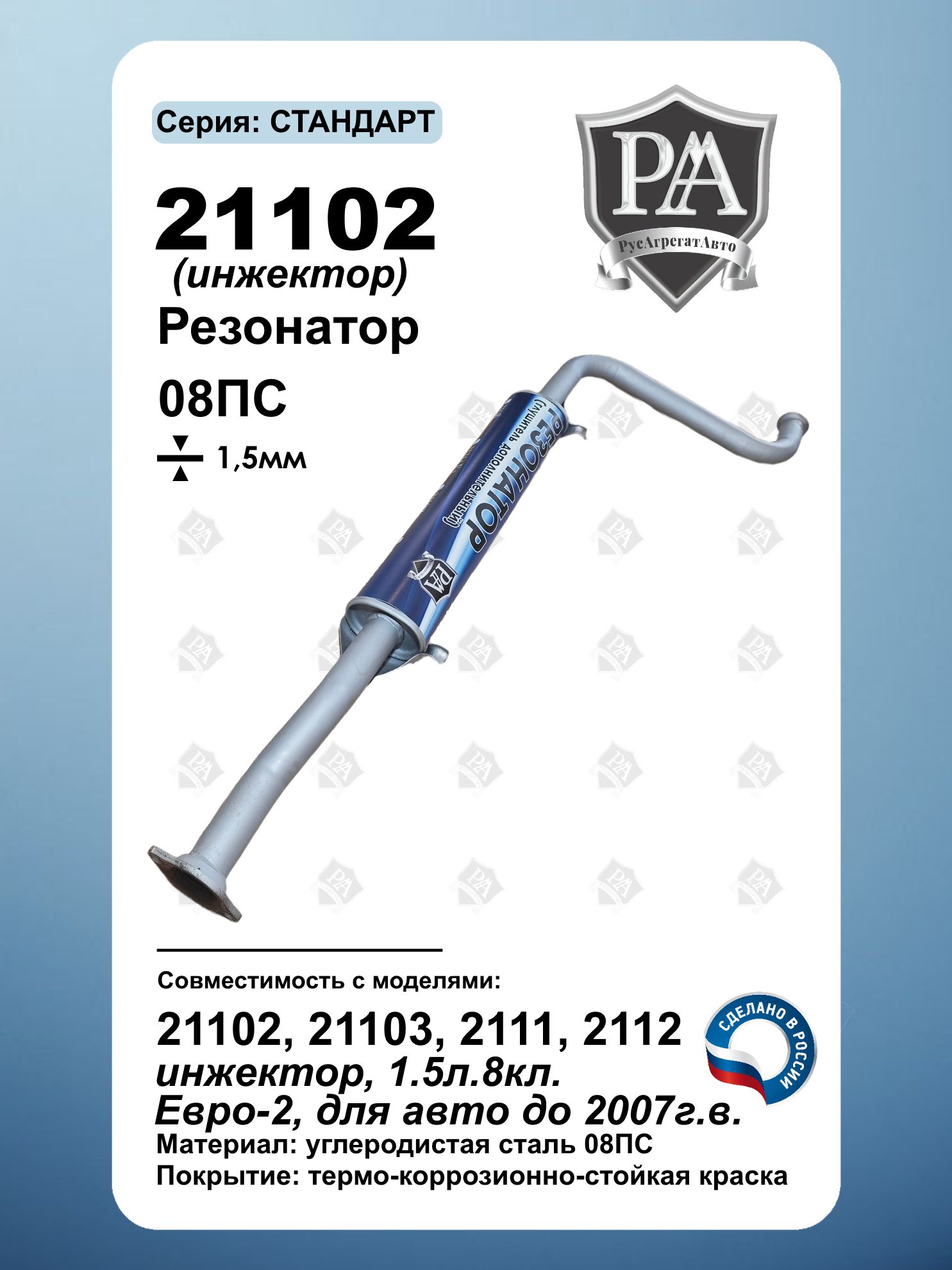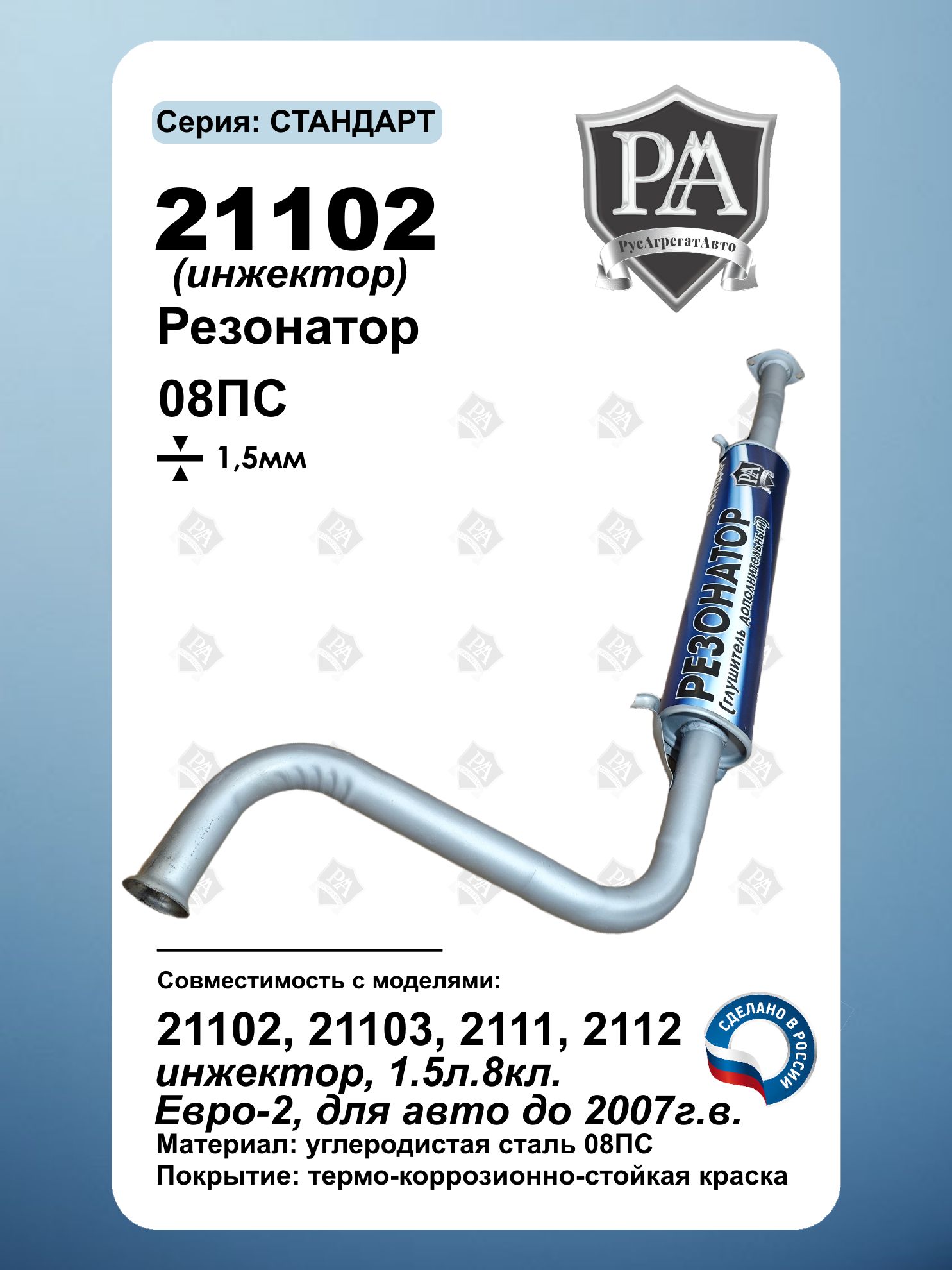 Резонатор 21102 РусАгрегатАвто серия СТАНДАРТ. Совместимость: 2110, 2111, 2112 (инжектор, двигатель 1.5 л 8 кл) Материал: высококачественная углеводородная сталь 08ПС толщиной 1,5 мм Особенности: Простота установки – монтируется на штатные места без доработок Оптимальное сочетание надежности, долговечности и доступной цены Идеальное решение для ремонта или замены резонатора в выхлопной системе вашего ВАЗ! Подходит для инжекторных моделей с двигателем 1.5 л. Сделано в России Совместим с ВАЗ 2110, ВАЗ 2111, ВАЗ 2112
