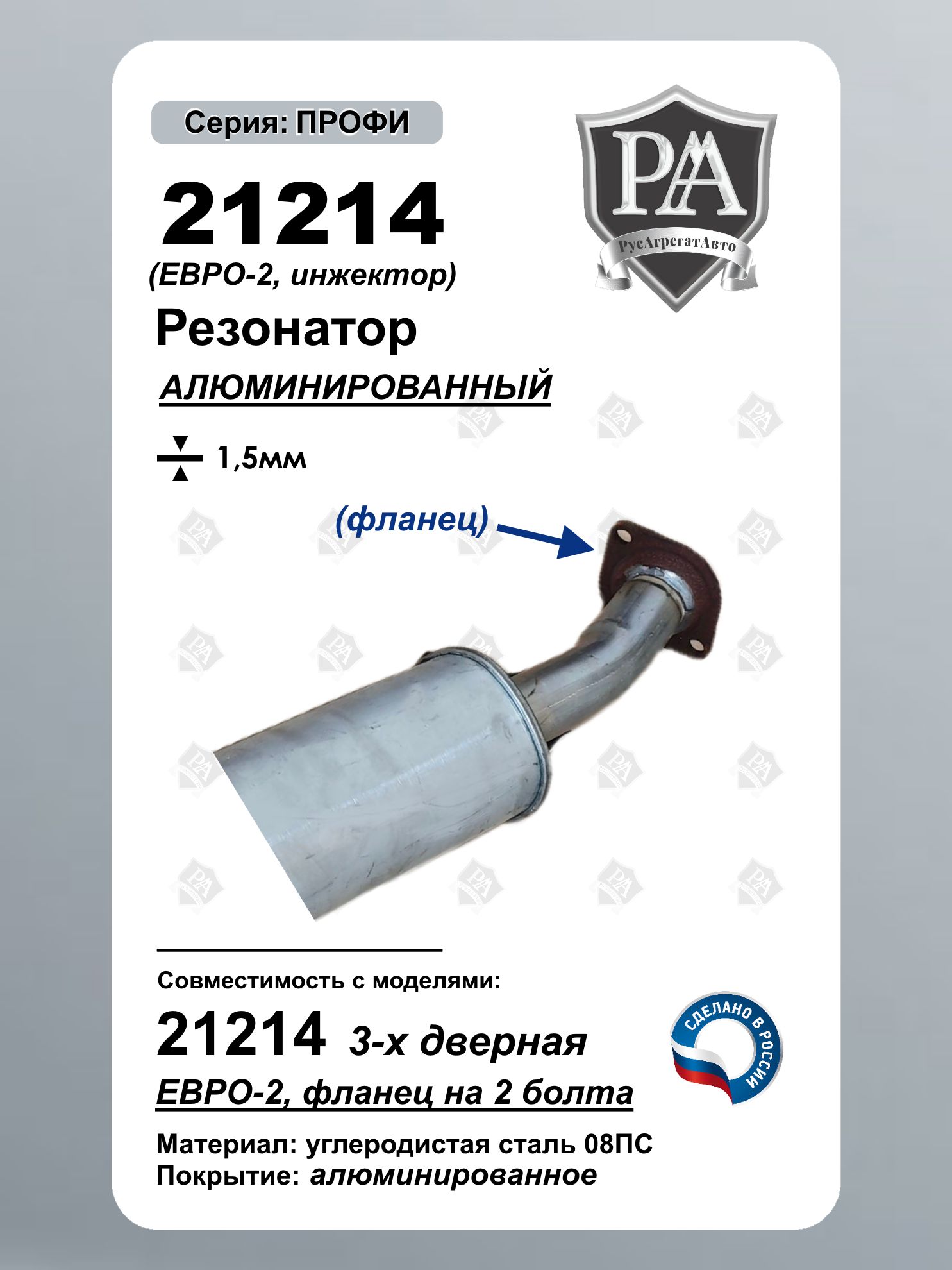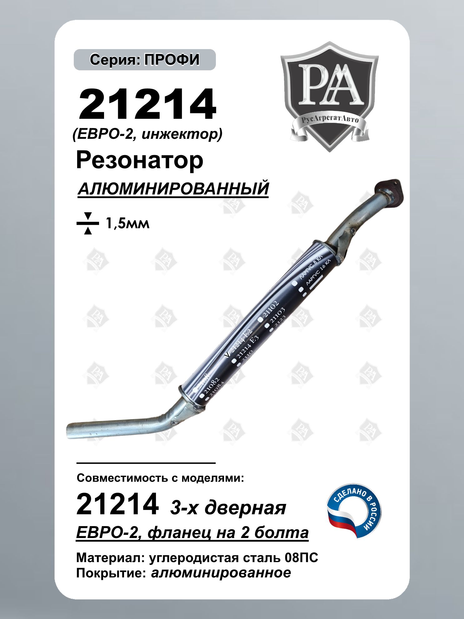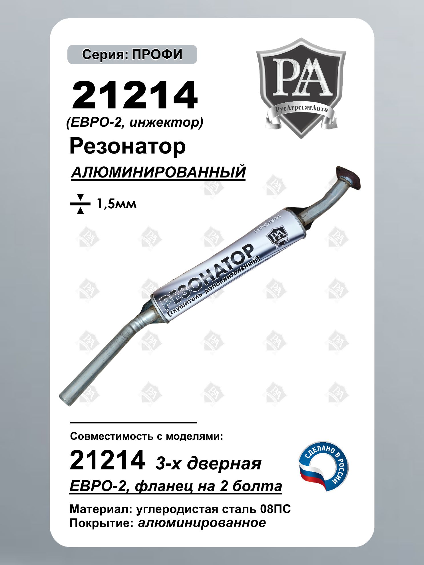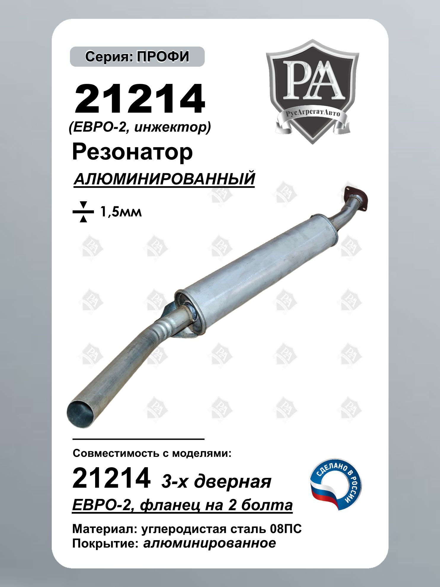 Резонатор РусАгрегатАвто из алюминированной (алюминизированной) стали серия ПРОФИ (дополнительный глушитель) для 21214 с экологическим классом Евро-2 Специальная конструкция обеспечивает эффективное снижение шума и соответствие экологическим нормам. Ключевые преимущества: Соответствие стандарту Евро-2 – экологичный выхлоп Эффективное шумопоглощение – снижение гула и вибраций Материал: Алюминированная сталь толщиной 1,5 мм Изготовлен из углеродистой стали 08ПС Точная заводская геометрия – совместимость со штатной выхлопной системой. Совместим с ВАЗ 21214 НИВА, Нива Легенд Сделано в России