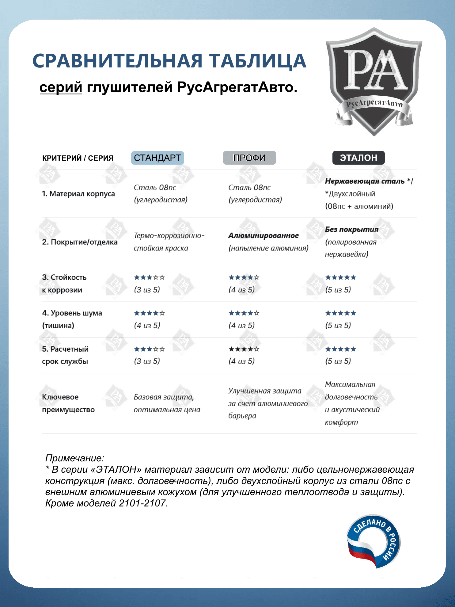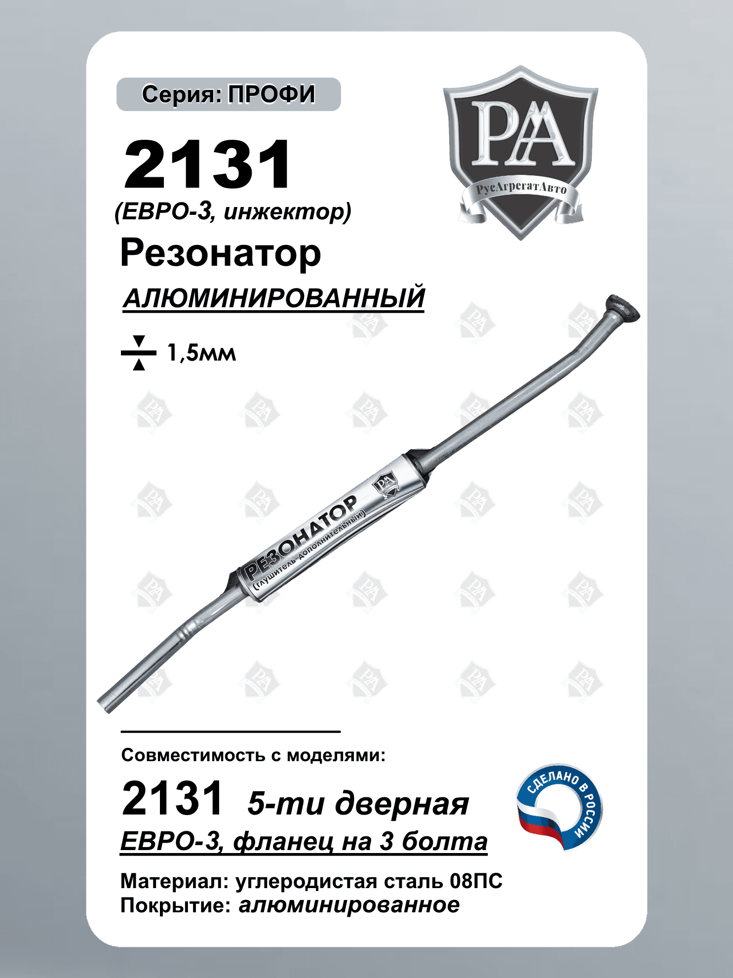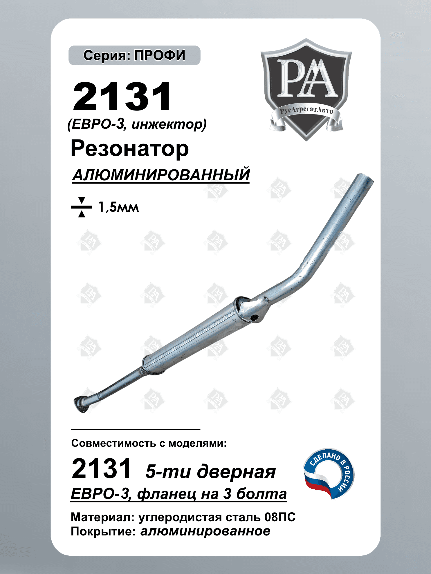 Резонатор РусАгрегатАвто из алюминированной (алюминизированной) стали серия ПРОФИ (дополнительный глушитель) ЕВРО-2 для 2131 с инжекторным двигателем Специально разработан для эффективного снижения шума и вибраций в выхлопной системе. Ключевые преимущества: Технология закатного корпуса - повышенная герметичность и срок службы\nУсовершенствованная 3-камерная система Материал: Алюминированная сталь толщиной 1,5 мм Точная заводская геометрия – установка без доработок Полное соответствие заводским стандартам - простая установка без доработок Идеальная совместимость - точное соответствие штатным креплениям Основные особенности: Покрытие – на стальную основу наносится тонкий слой алюминия (обычно методом горячего погружения или напылением). Защита от коррозии – алюминий образует плотную оксидную плёнку, предотвращающую ржавление стали. Термостойкость – выдерживает высокие температуры (до ~600–800°C), поэтому применяется в печах, выхлопных системах и т. д. Электропроводность и отражательная способность – алюминиевый слой улучшает эти свойства Совместим с ВАЗ 2131 НИВА, Нива Легенд Сделано в России