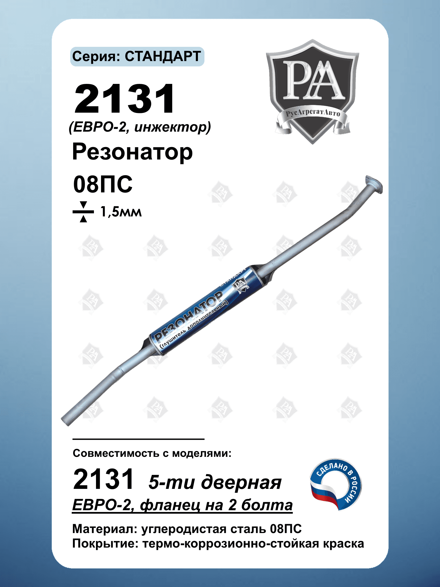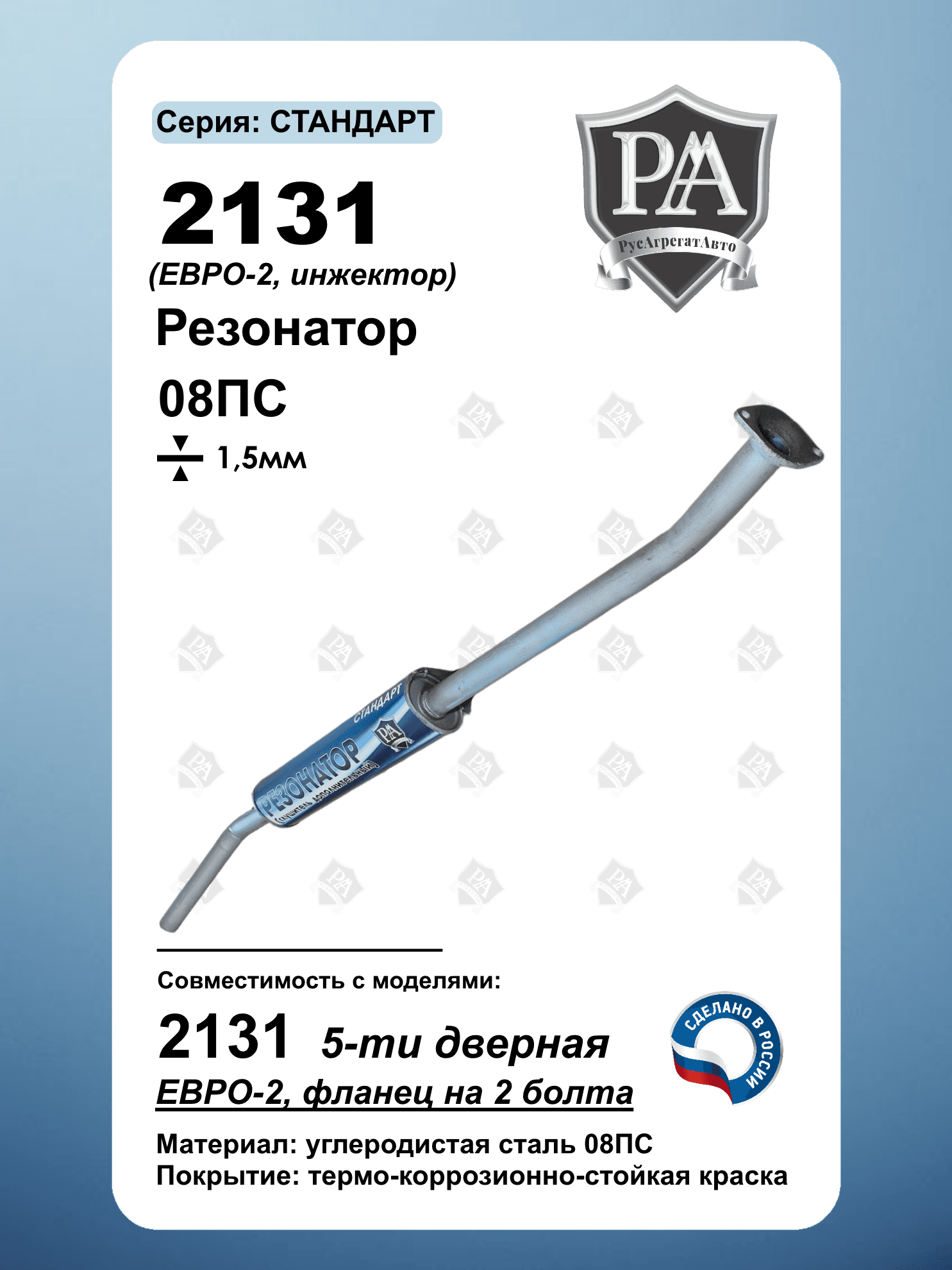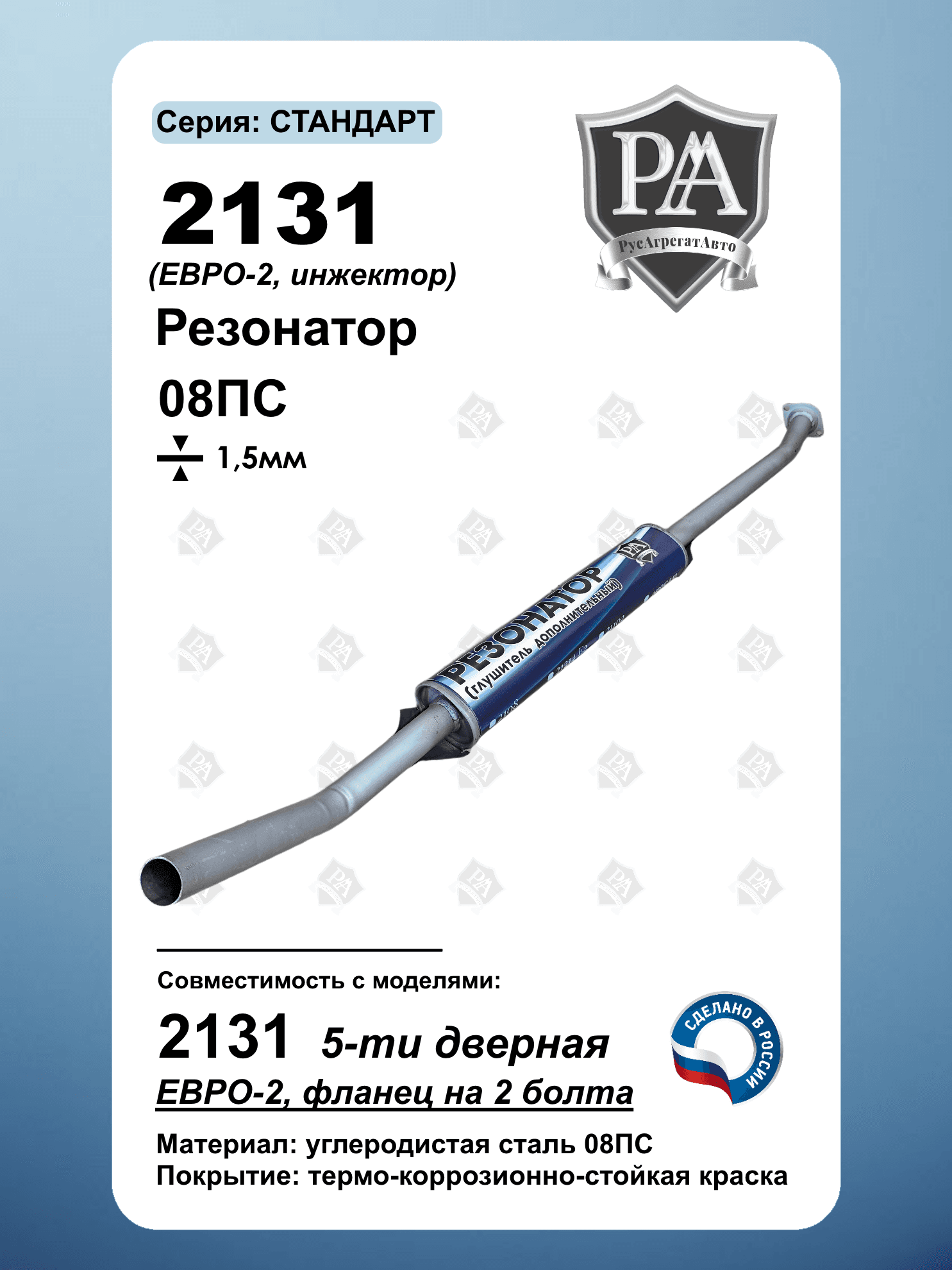 Резонатор РусАгрегатАвто серия СТАНДАРТ (дополнительный глушитель) для 2131 5-ти дверная с экологическим классом Евро-2 Специальная конструкция обеспечивает эффективное снижение шума и соответствие экологическим нормам. Ключевые преимущества: Соответствие стандарту Евро-2 – экологичный выхлоп Эффективное шумопоглощение – снижение гула и вибраций Усиленная сталь 1,5 мм Изготовлен из углеродистой стали 08ПС Точная заводская геометрия – совместимость со штатной выхлопной системой. Совместим с ВАЗ 2131 НИВА, Нива Легенд Сделано в России