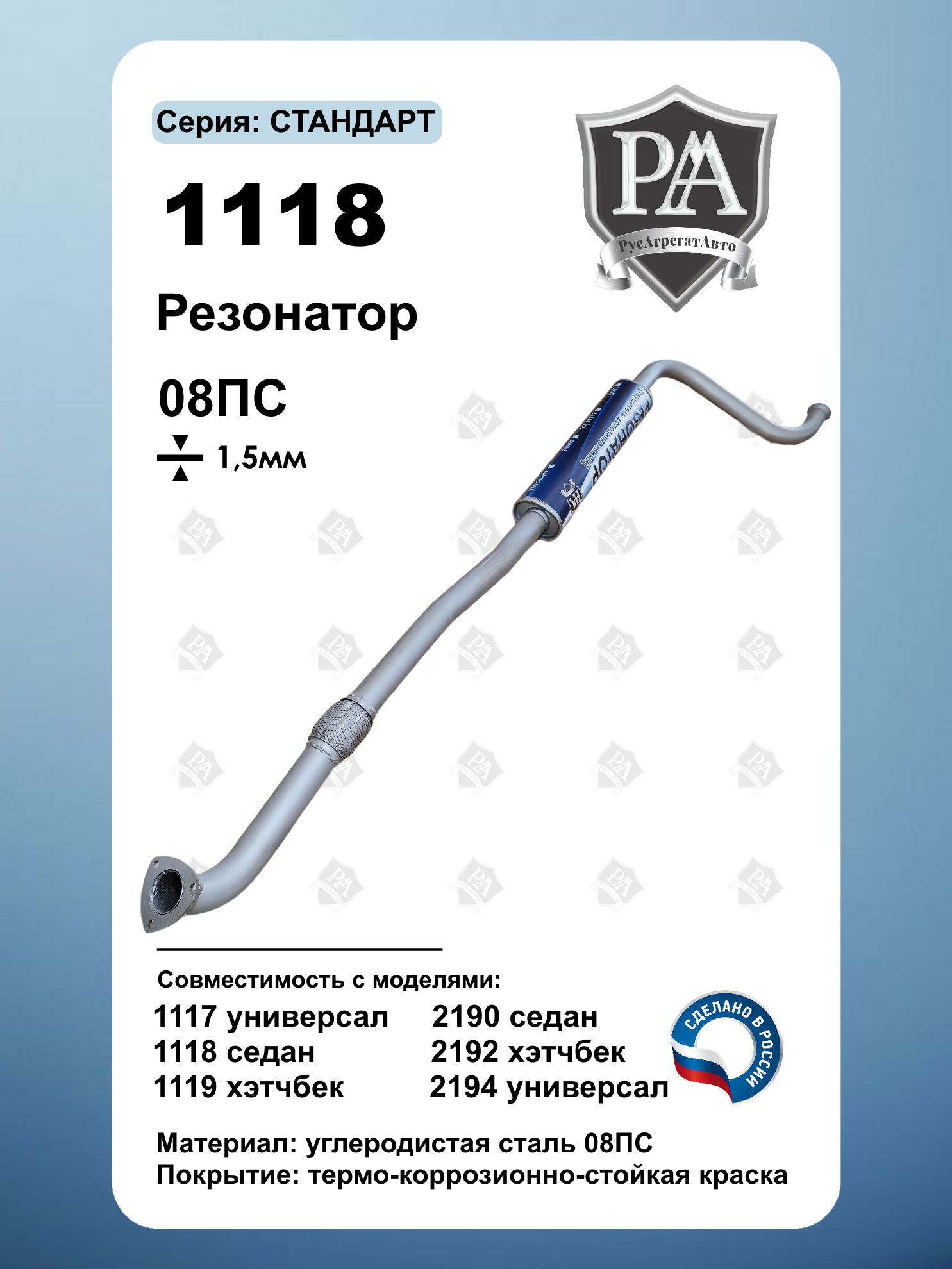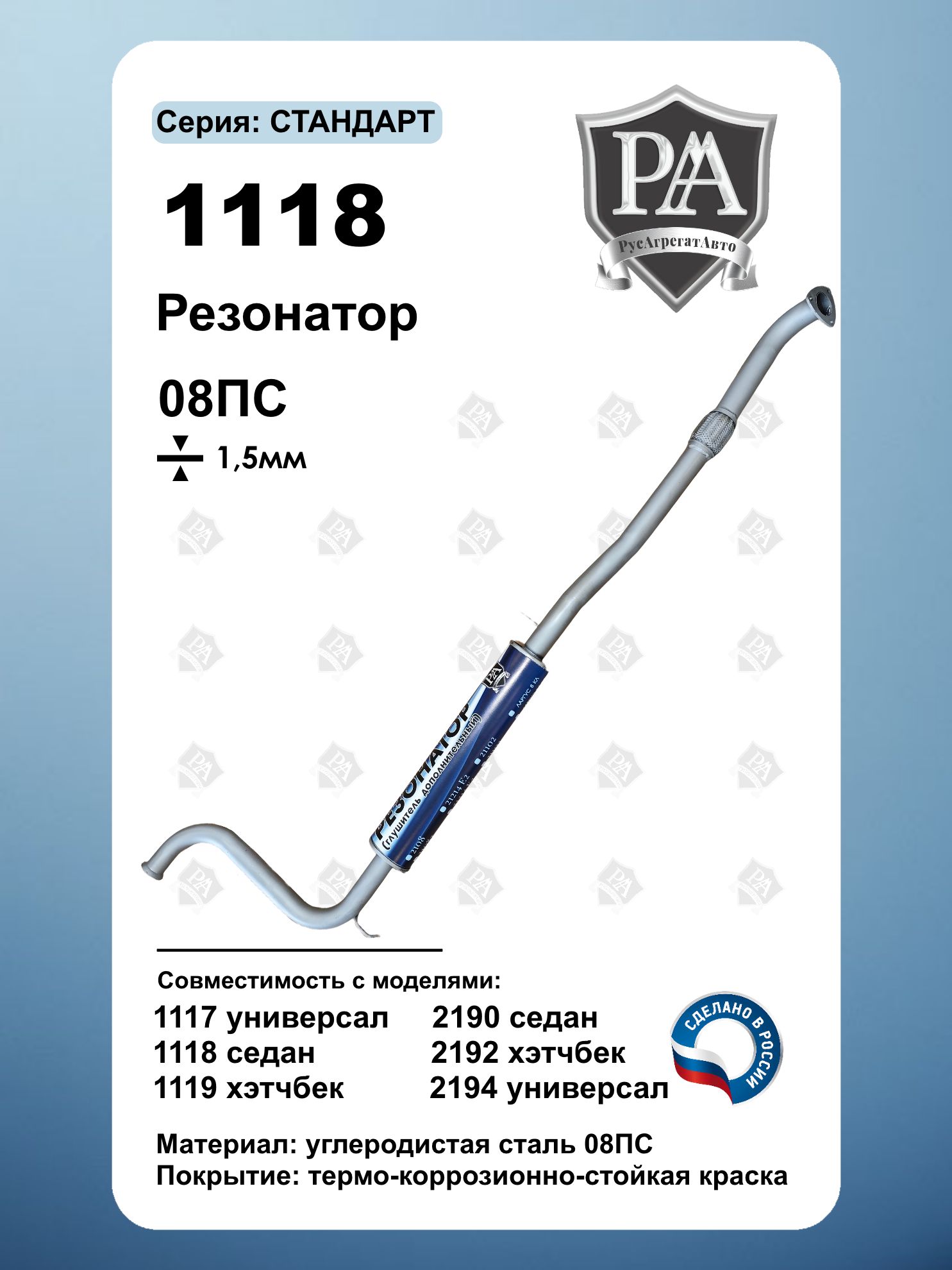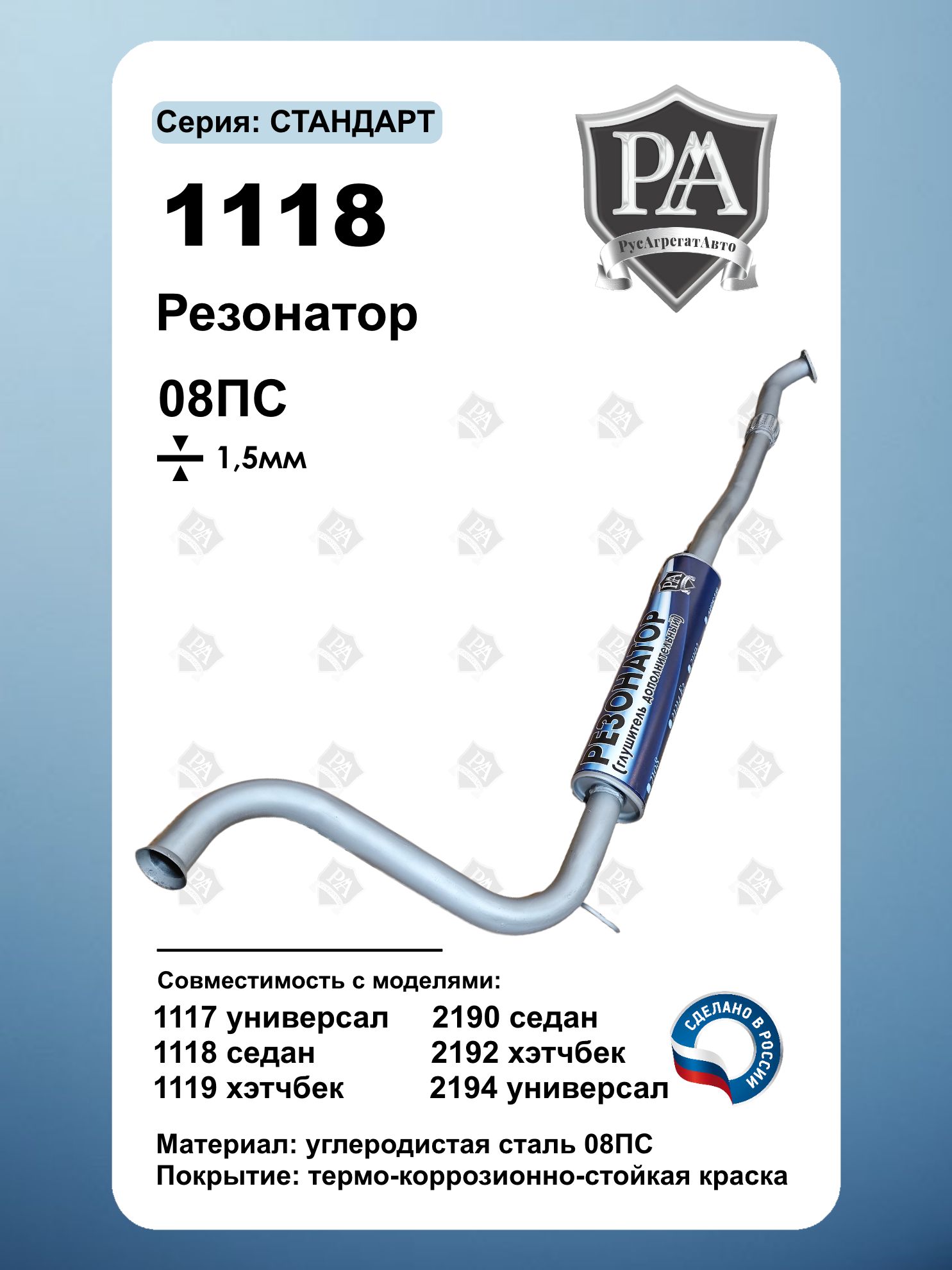 Резонатор с компенсатором РусАгрегатАвто серия СТАНДАРТ для 1118, 1117 1119 седан/универсал/хэтчбек и подходит для Granta седан, лифтбек, хэтчбек и универсал 2190,2191,2192,2194 (сталь 08ПС 1.5 мм) – прибавка мощности и снижение шума! Назначение: Резонатор – ключевой элемент выхлопной системы, выполняющий роль предварительного глушителя. Он снижает уровень шума и стабилизирует поток отработанных газов, улучшая работу двигателя. Преимущества: Прибавка мощности – оптимизирует поток выхлопных газов Снижение шума – эффективное гашение колебаний Универсальность – Совместим с Lada Калина (Kalina) 1118, 1117, 1119,Lada Granta (Гранта) 2190,2191,2192,2194 седан, лифтбек, хэтчбек и универсал Усиленная конструкция – сталь 1.5 мм Изготовлен из углеродистой стали 08ПС Точная заводская геометрия – установка без доработок Улучшите динамику и звук выхлопа – выберите резонатор от проверенного производителя Сделано в России