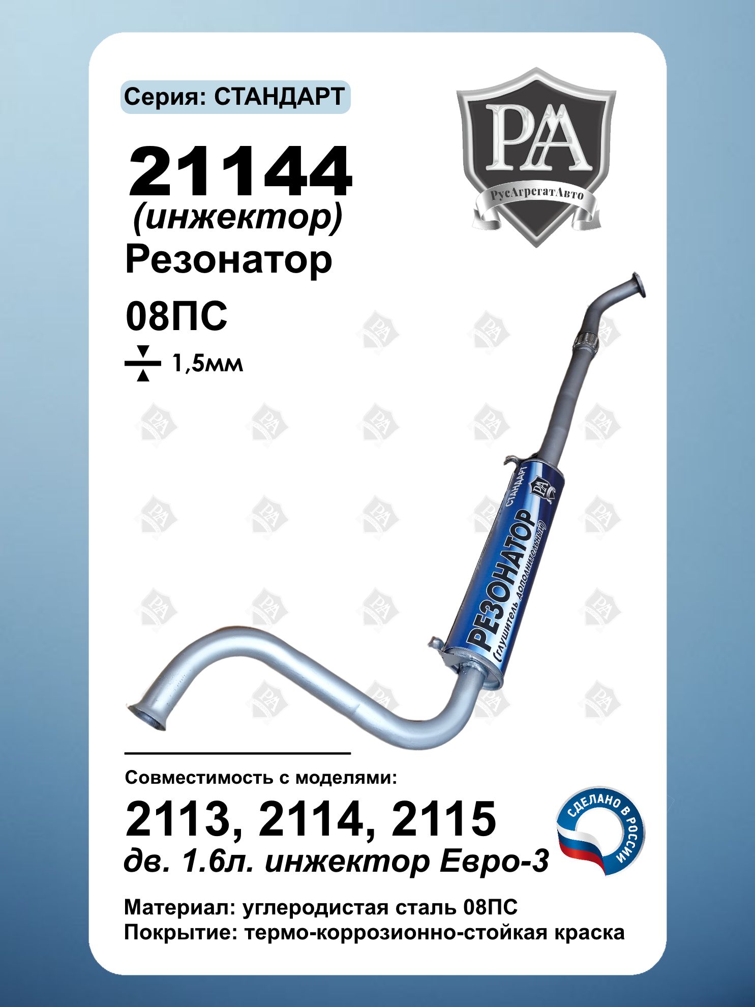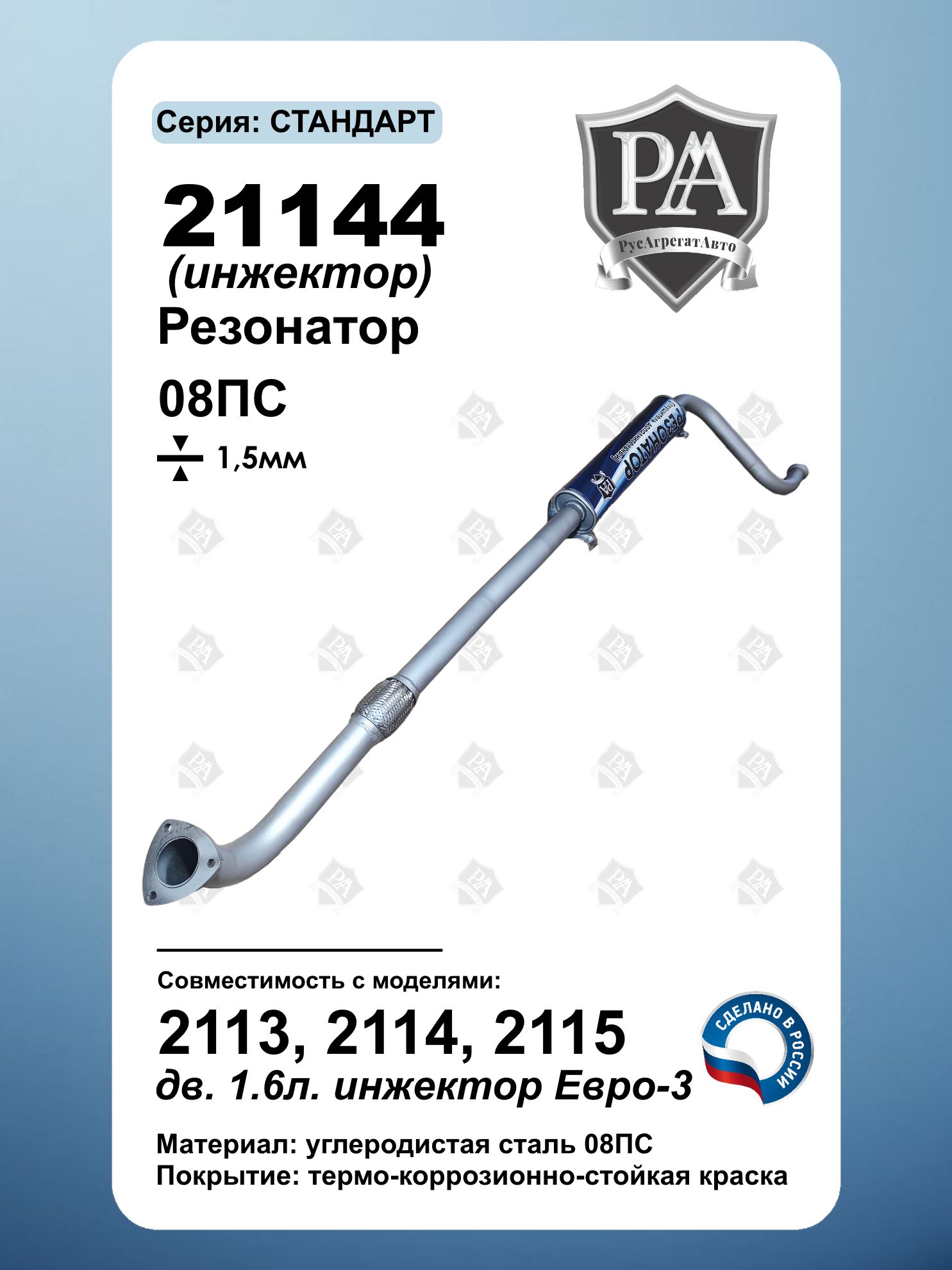 3-камерный Резонатор 21144 с компенсатором РусАгрегатАвто серия СТАНДАРТ нового типа крепления для автомобилей 2113, 2114, 2115 с двигателем 1.6 л. Произведён с использованием технологии закатного корпуса. Ключевые преимущества: Компенсатор вибраций – снижение нагрузки на выхлопную систему 3-камерная система – максимальное шумопоглощение Закатной корпус – повышенная герметичность и срок службы Усиленная конструкция – сталь 1.5 мм Изготовлен из углеродистой стали 08ПС Точная заводская геометрия – установка без доработок Новое крепление – для автомобилей с современной подвеской глушителя Оптимизирован для 1.6 л двигателя – идеальное согласование с выхлопом Сделано в России Совместим с ВАЗ 2115, ВАЗ 2114, ВАЗ 2113