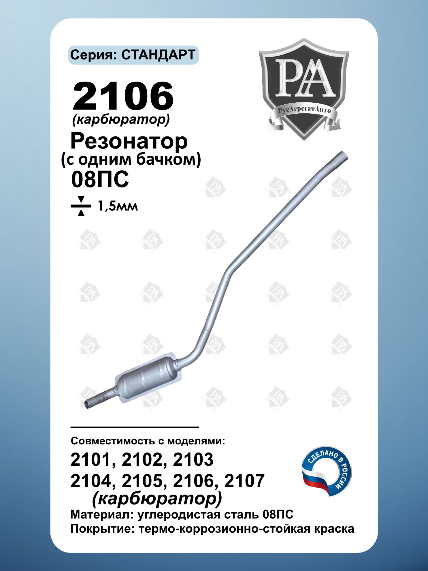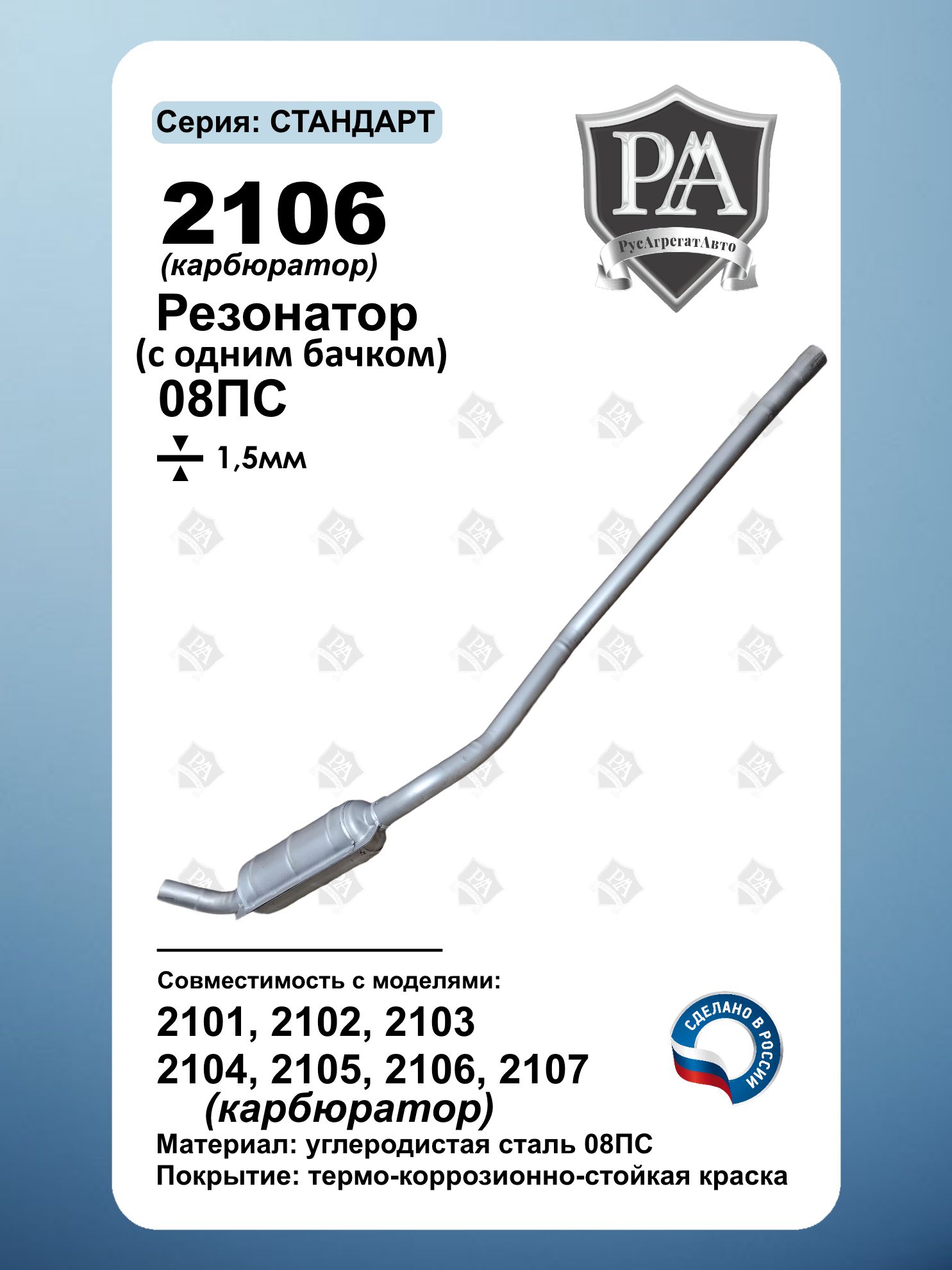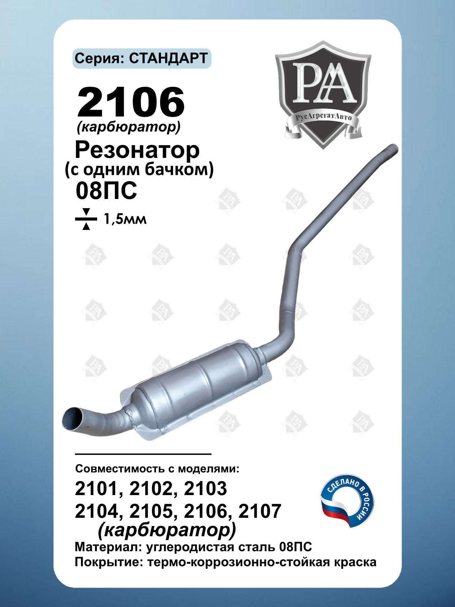 Резонатор с 1 бачком РусАгрегатАвто серия СТАНДАРТ для автомобилей 2101-2107 (карбюратор)! Идеальная посадка – устанавливается в штатное место без доработок, полностью соответствует заводской геометрии. Прочная конструкция – изготовлен из углеродистой стали 08ПС (1,5 мм), российское производство. Антикоррозийная защита – покрыт серебристой краской для увеличения срока службы. Совместим с ВАЗ 2101, ВАЗ 2102, ВАЗ 2103, ВАЗ 2104, ВАЗ 2105, ВАЗ 2106, ВАЗ 2107 с карбюраторным двигателем. Простота установки, долговечность и комфортная езда – выберите оригинальное качество! Гарантия тихой работы и надежности – без лишнего шума! Сделано в России