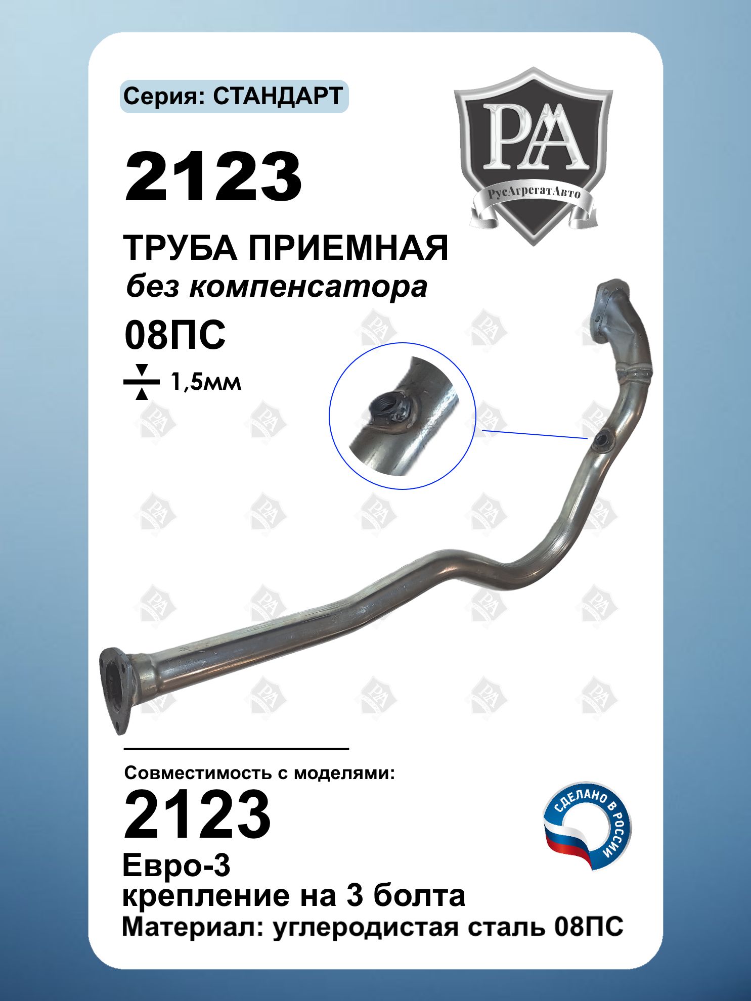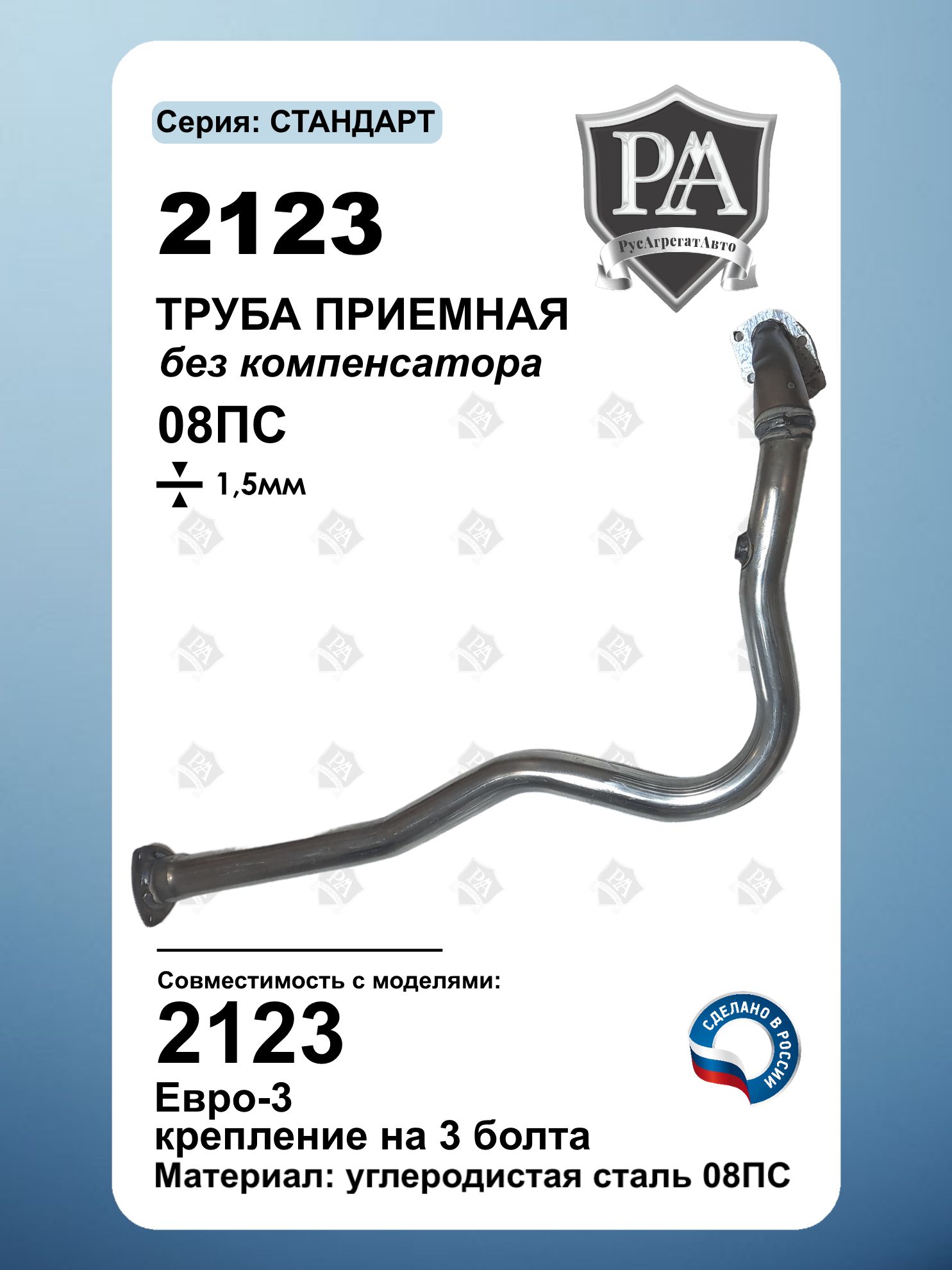 Труба приемная 2123 без компенсатора\nПолное соответствие заводским параметрам – точные гибы, штатные крепления для быстрой установки без доработок.\nТруба изготовлена из качественной стали 08ПС толщиной 1,5 мм, что обеспечивает повышенную коррозионную стойкость и долговечность.\nСоответствие экологическим нормам – подходит для автомобилей с системами выпуска Евро-3\nНадежное крепление – фиксация на 3 болта (штатная схема установки).\nСовместим для моделями ВАЗ 2123 ЕВРО 3 Шевроле Нива, Chevrolet Niva. Гарантия качества – изделие надежно работает в любых дорожных условиях.\nЛегкая установка – полная совместимость с родной системой выпуска, подходит как для замены изношенного резонатора, так и для ремонта выхлопной системы.\nСделано в России