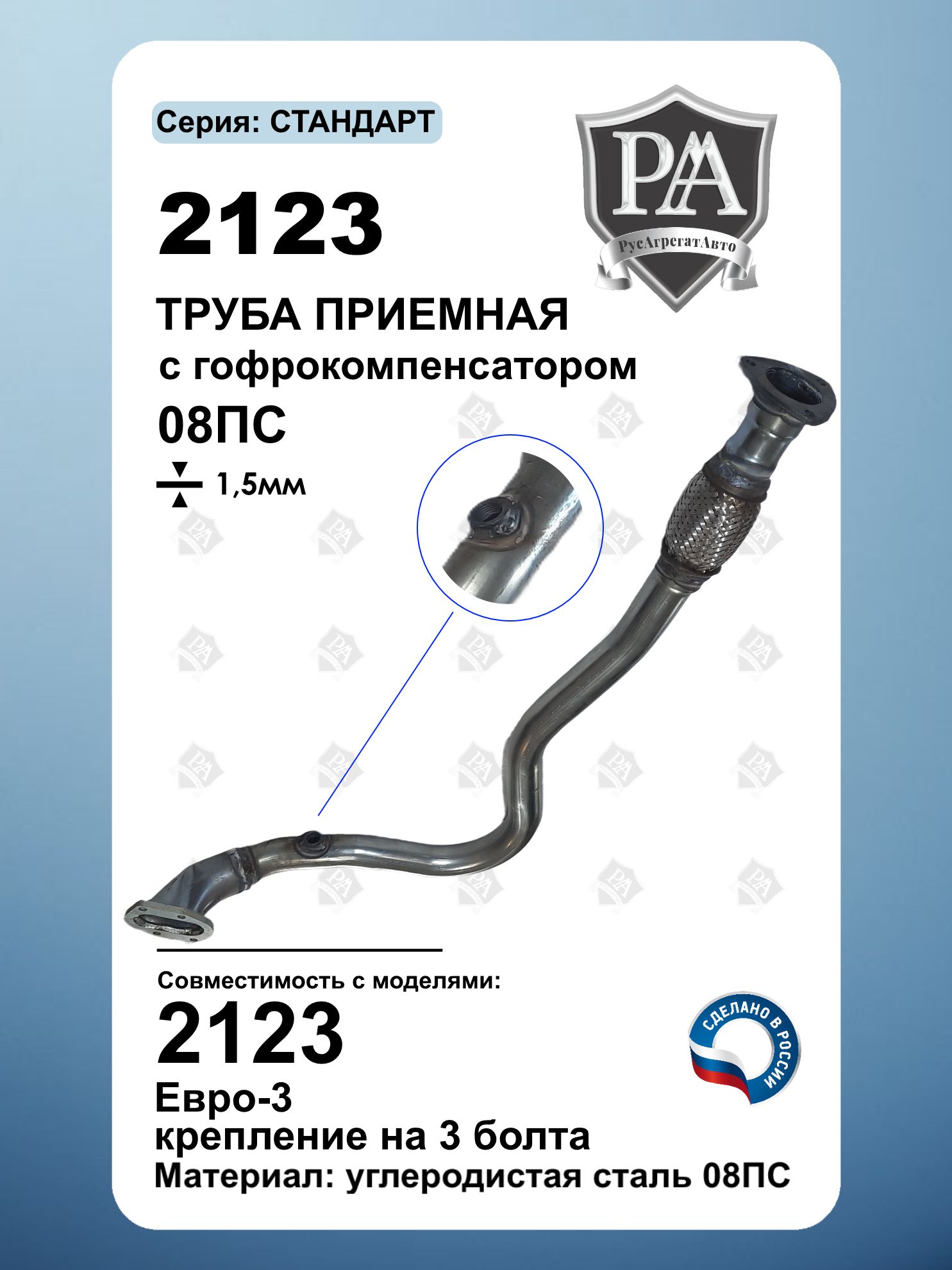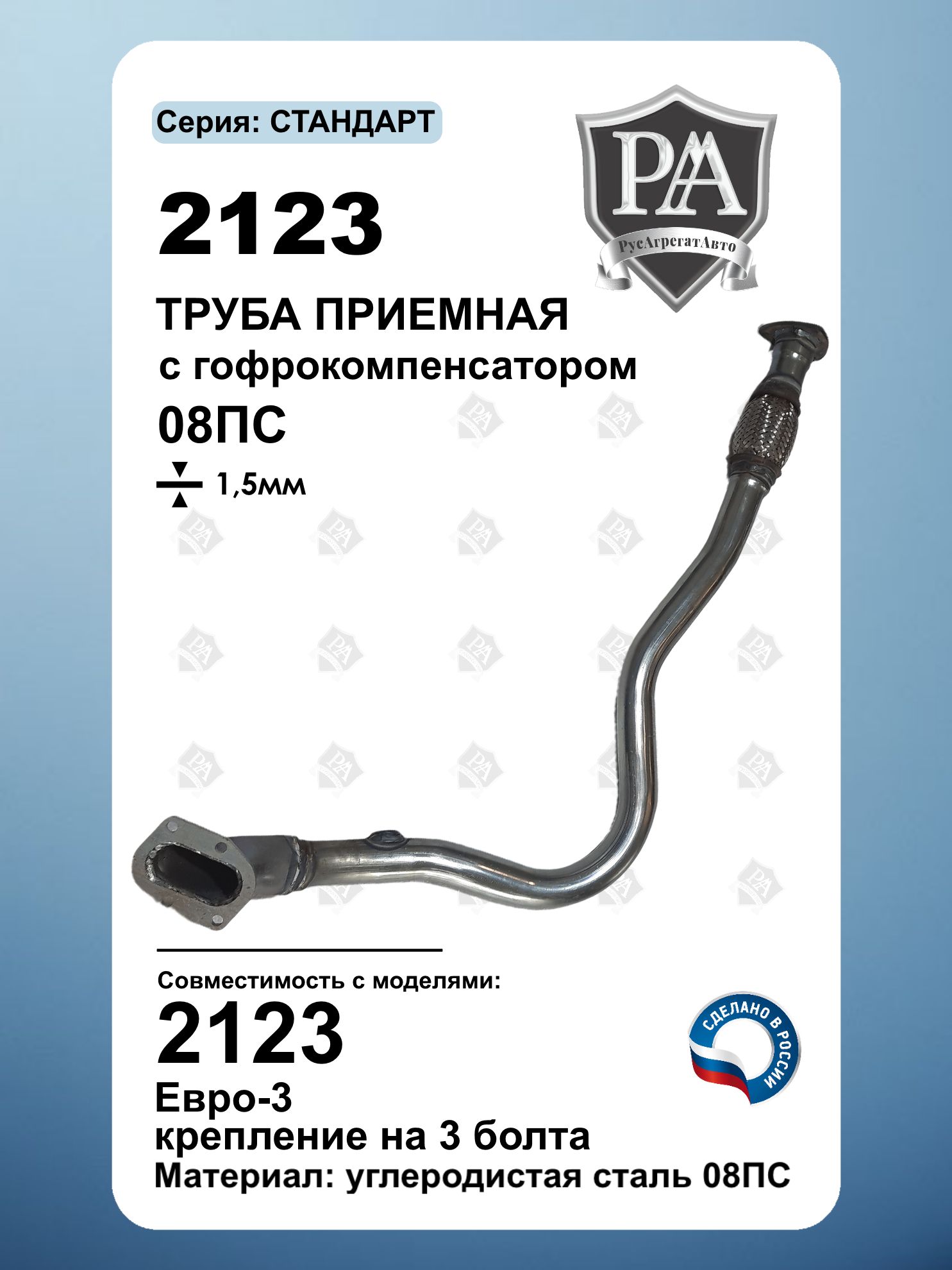 Труба приемная ЕВРО-3 для 2123 с компенсатором ( гофрой )\nПолное соответствие заводским параметрам – точные гибы, штатные крепления для быстрой установки без доработок.\nТруба изготовлена из качественной стали 08ПС толщиной 1,5 мм, что обеспечивает повышенную коррозионную стойкость и долговечность.\nСоответствие экологическим нормам – подходит для автомобилей с системами выпуска Евро-3\nНадежное крепление – фиксация на 3 болта (штатная схема установки).\nСовместим для моделями ВАЗ 2123 с 2008 г.в. Шевроле Нива, Chevrolet Niva Гарантия качества – изделие надежно работает в любых дорожных условиях.\nЛегкая установка – полная совместимость с родной системой выпуска, подходит как для замены изношенного резонатора, так и для ремонта выхлопной системы.\nСделано в России