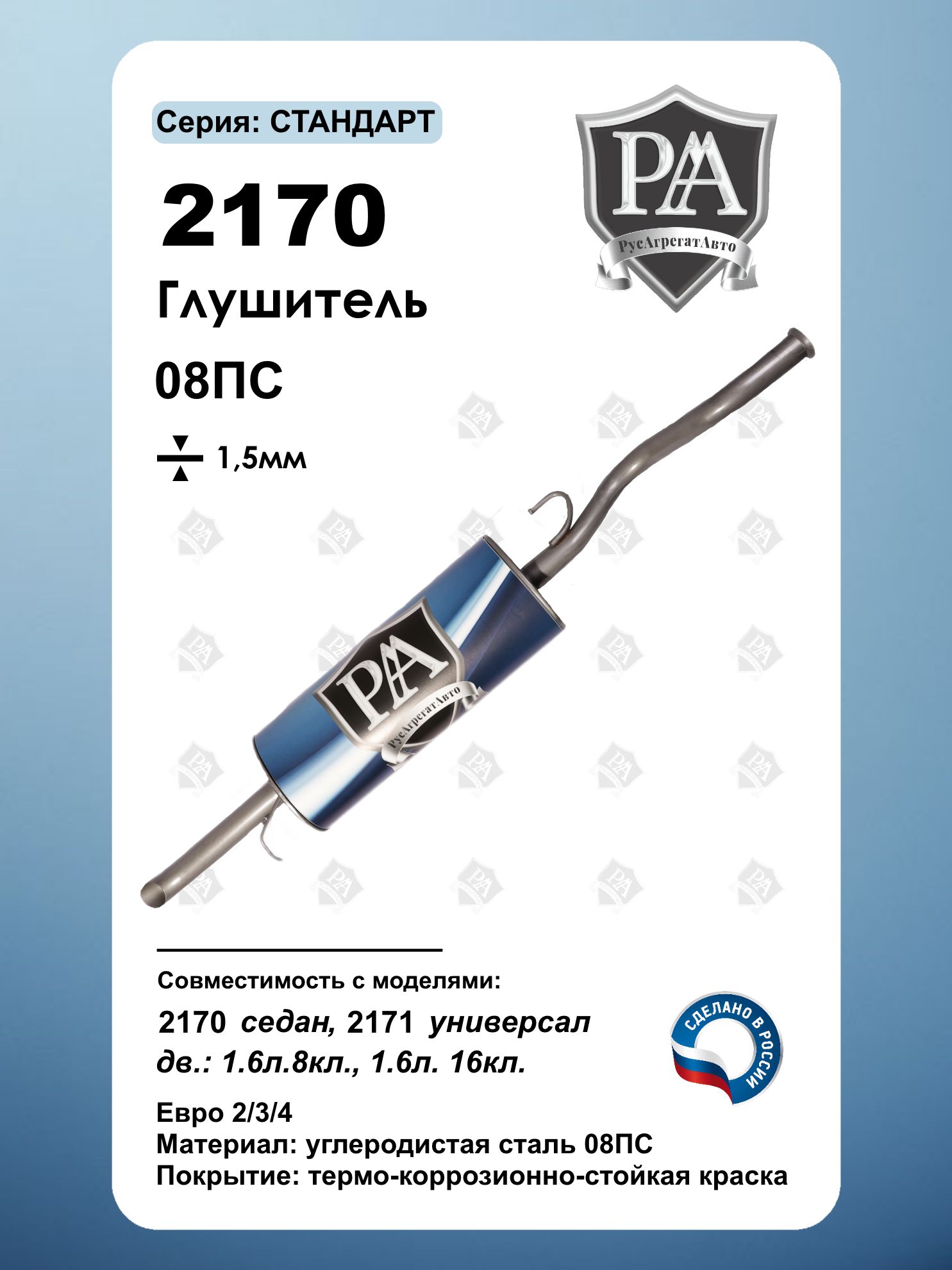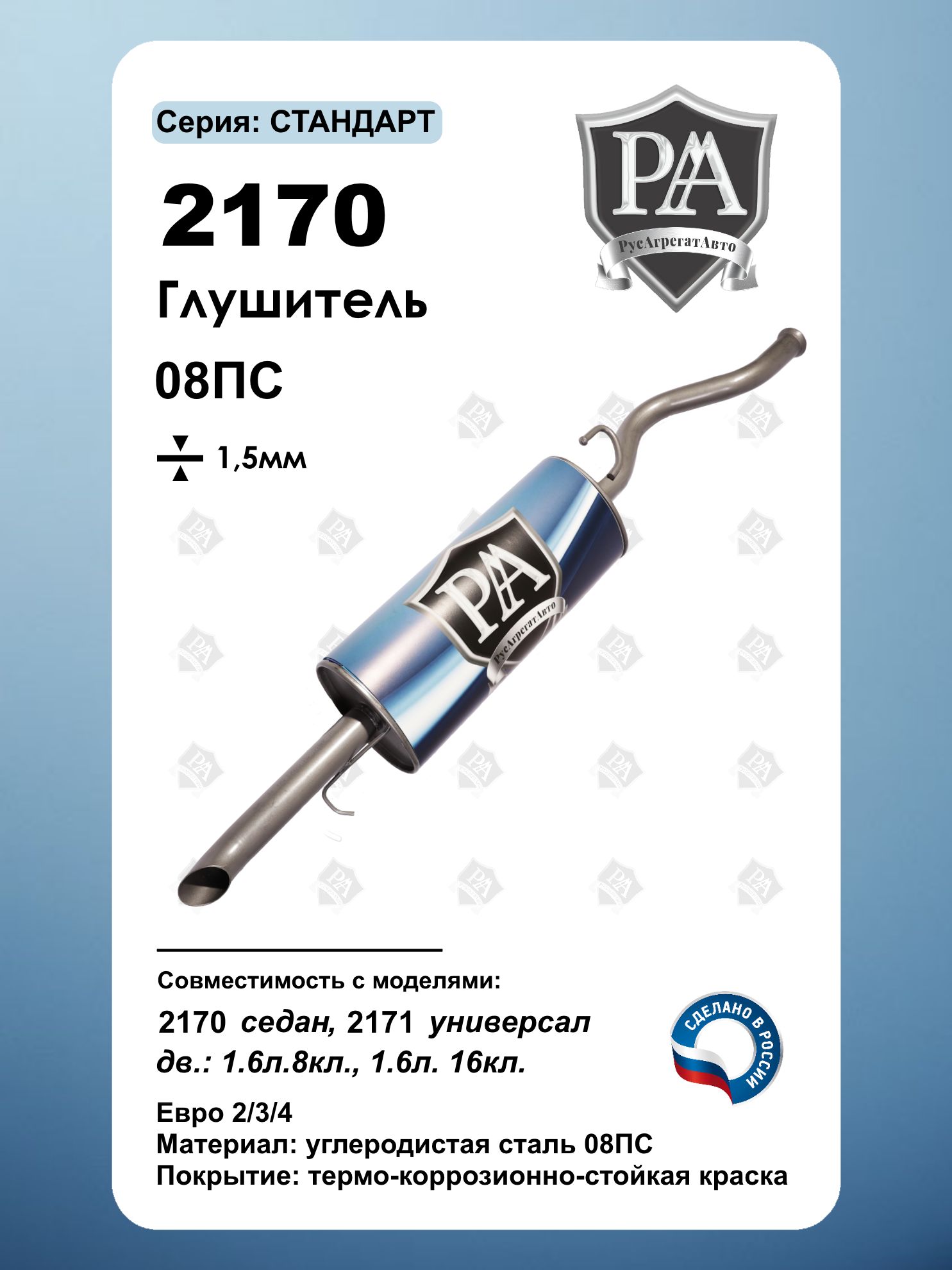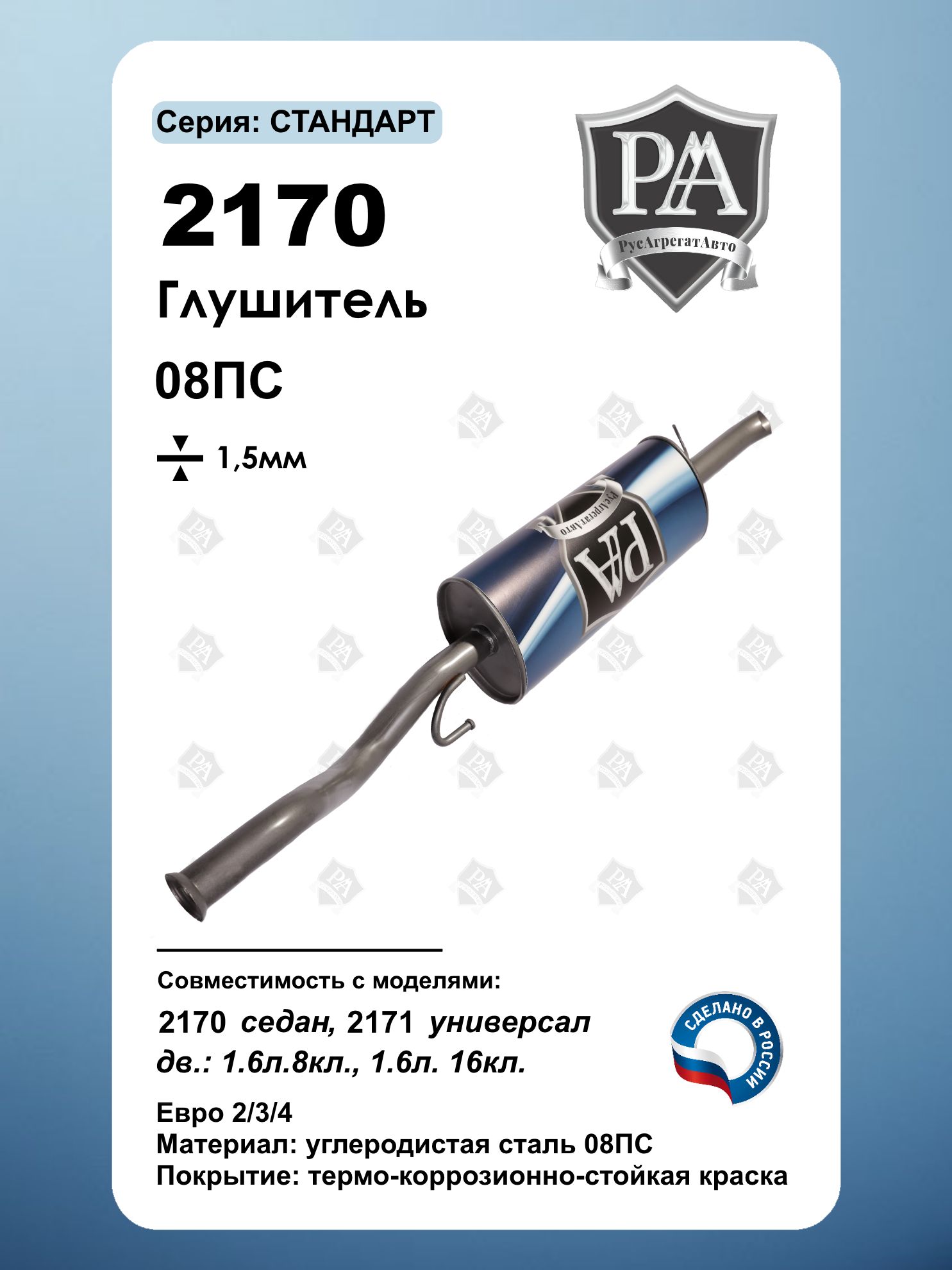Глушитель РусАгрегатАвто серии СТАНДАРТ для 2170 седан и 2171 универсал Изготовлен из высококачественной углеродистой стали 08 ПС толщиной 1,5 мм с соблюдением экологического стандарта ЕВРО-3. Ключевые преимущества: 3-камерная система – эффективное снижение шума выхлопа Закатной корпус – повышенная прочность и герметичность Соответствие стандарту ЕВРО-3 - экологичный выхлоп Усиленная конструкция - сталь 08 ПС толщиной 1,5 мм Точная заводская геометрия - идеальная посадка Эффективное шумопоглощение - комфорт в салоне Совместим с автомобилями ВАЗ Priora (Приора) Сделано в России
