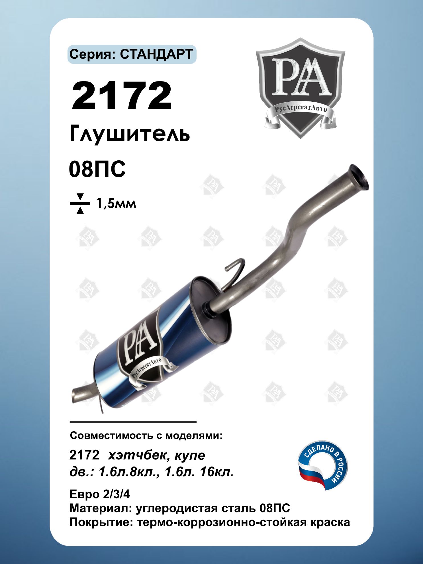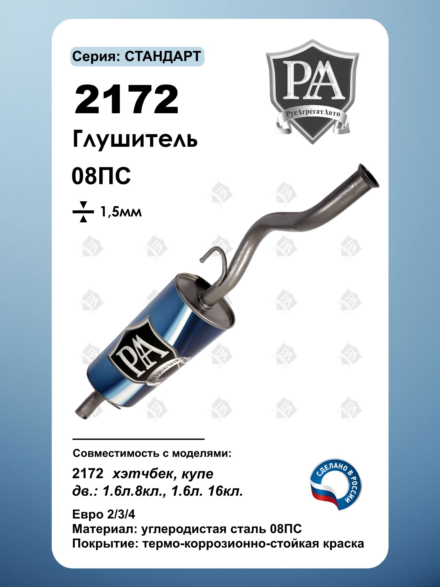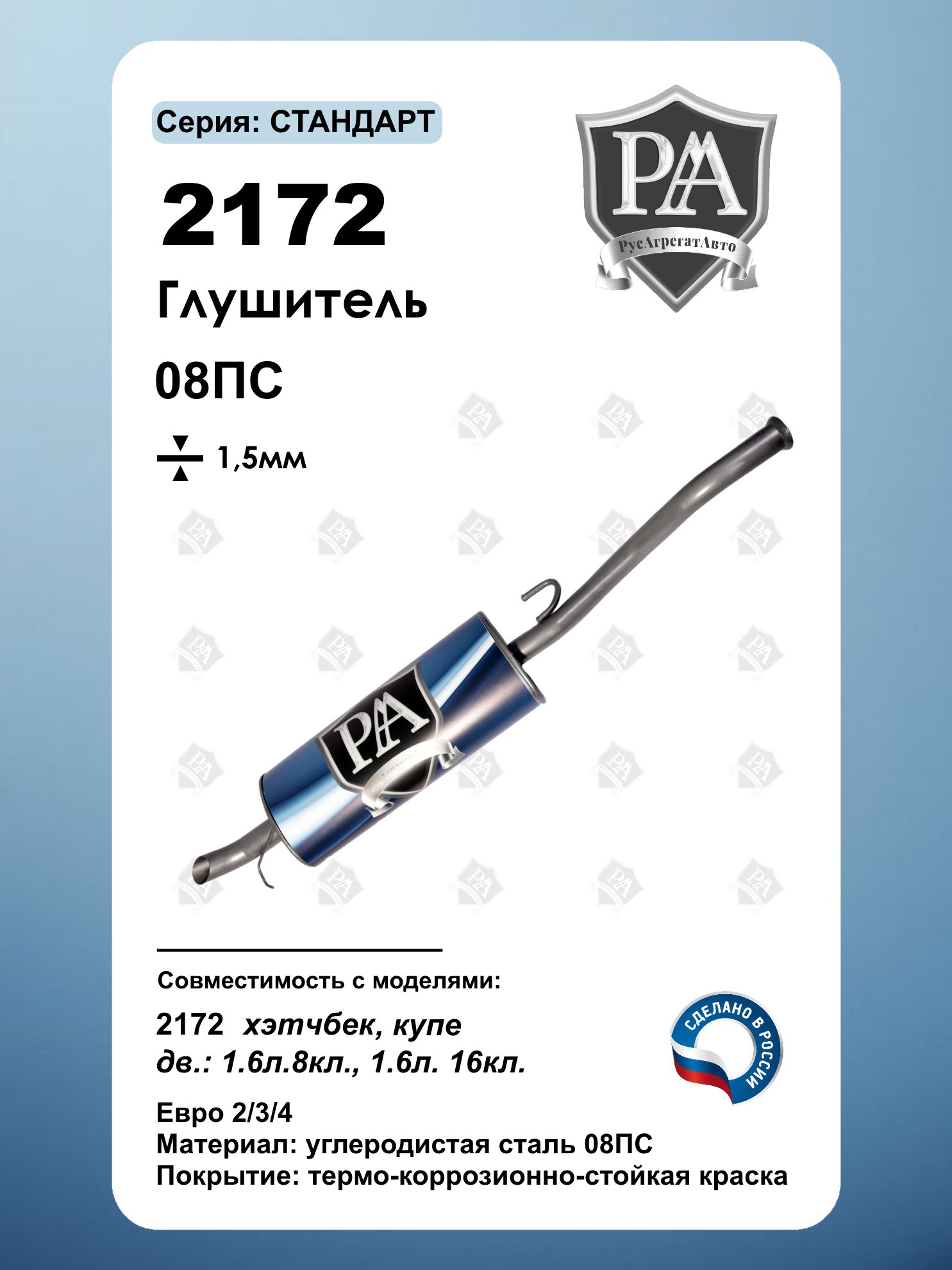 Глушитель РусАгрегатАвто серии СТАНДАРТ для 2172 хэтчбек Изготовлен из высококачественной углеродистой стали 08 ПС толщиной 1,5 мм, что обеспечивает надежность и долговечность эксплуатации. Ключевые преимущества: Усиленная конструкция – сталь 1.5 мм Изготовлен из углеродистой стали 08ПС Точная заводская геометрия – установка без доработок Эффективное шумопоглощение - комфортный уровень звука Оптимальный отвод выхлопных газов - улучшенные характеристики выхлопной системы Совместим с автомобилями ВАЗ Priora (Приора) Сделано в России